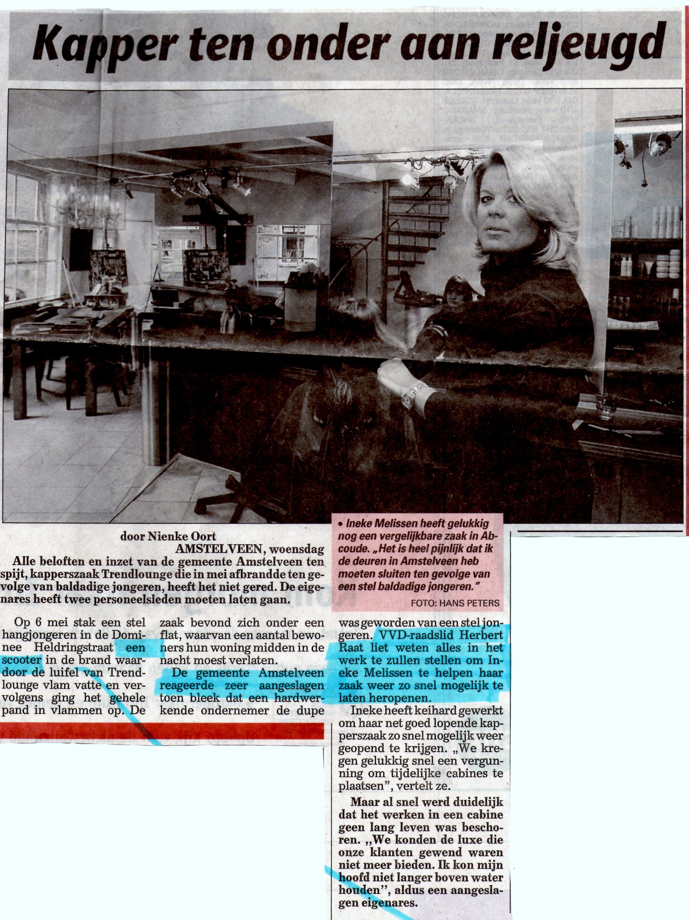 De kapperszaak aan het Augustinuspark is maandagnacht in vlammen opgaan. Bewoners moesten worden geëvacueerd en een oude bewoonster brak haar heup in alle consternatie. De eigenaars van de zaak en hun personeel zijn hun werkplek kwijt. Dit nadat waarschijnlijk een paar idioten een scooter in brand hadden gestoken waardoor de luifel van het pand vlamt vatte.