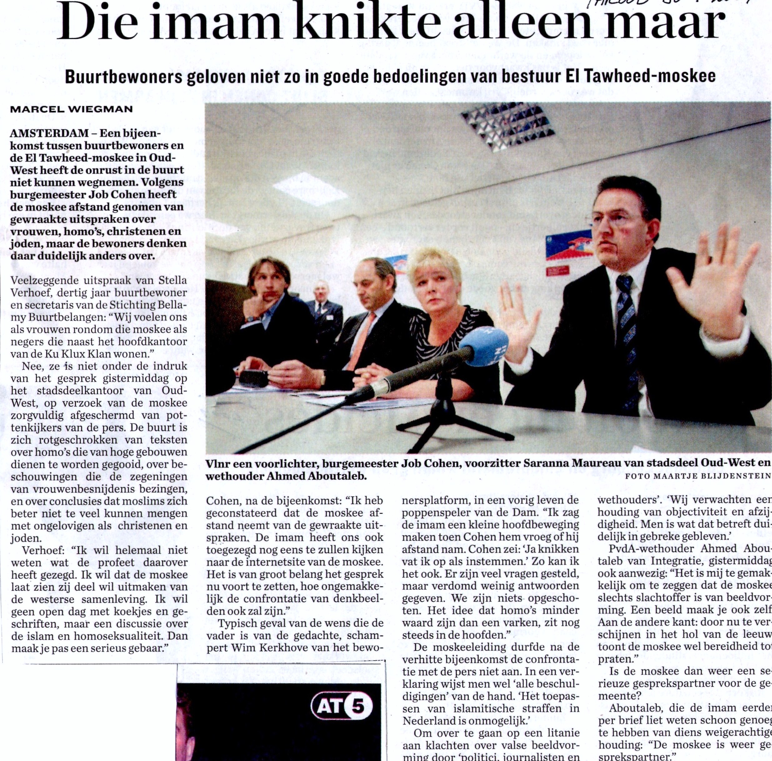 De eerste opdracht die ik van hem kreeg was toen moskee El Tawheed in Oud-West boeken verkocht waarin stond dat homo’s van een hoog gebouw gegooid moeten worden. Aboutaleb was woedend en nam meteen stelling. Ook in een besloten bijeenkomst met de burgemeester kreeg de moskee de wind van voren.