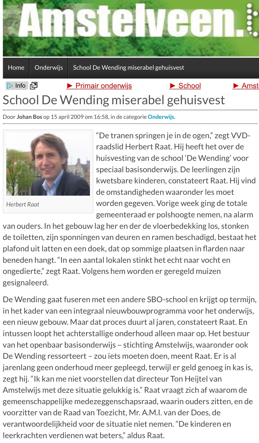 Het kan toch niet zo zijn dat het bestuur Amstelwijs al jaren geen euro meer aan onderhoud van de Wending besteedt. Zeker als je weet dat ze voldoende financiële middelen hebben. Ik kan me niet voorstellen dat directeur Ton Heijtel van Amstelwijs met deze situatie gelukkig is. De Gemeendschappelijke Medezeggenschapsraad (GMR) van ouders en de voorzitter van de Raad van Toezicht, Mevrouw. Mr. A.M.I. van der Does ken ik niet.