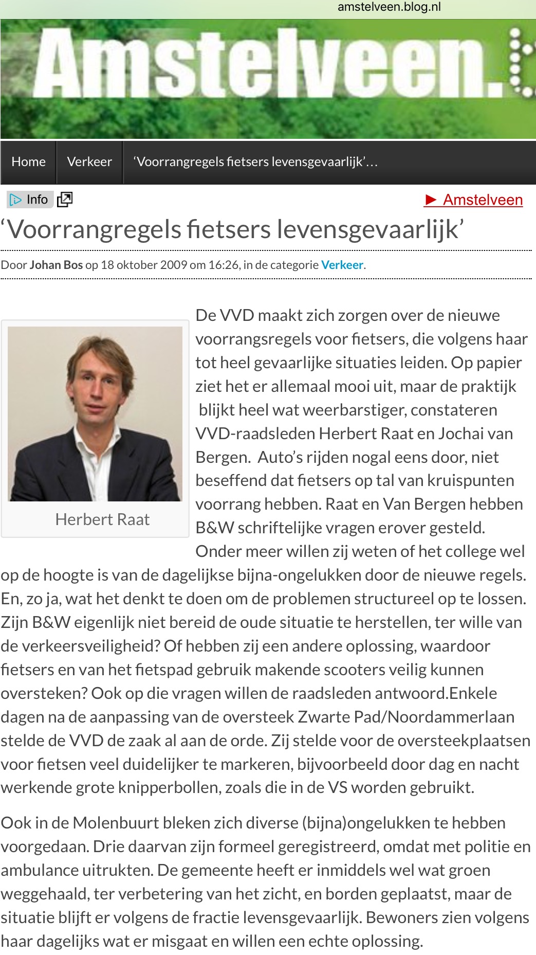 Amstelveen is één van de eerste gemeenten waar het principe van voorrang voor alle fietsers wordt ingevoerd. Prachtig principe, alleen in de praktijk geeft het levensgevaarlijk situaties.