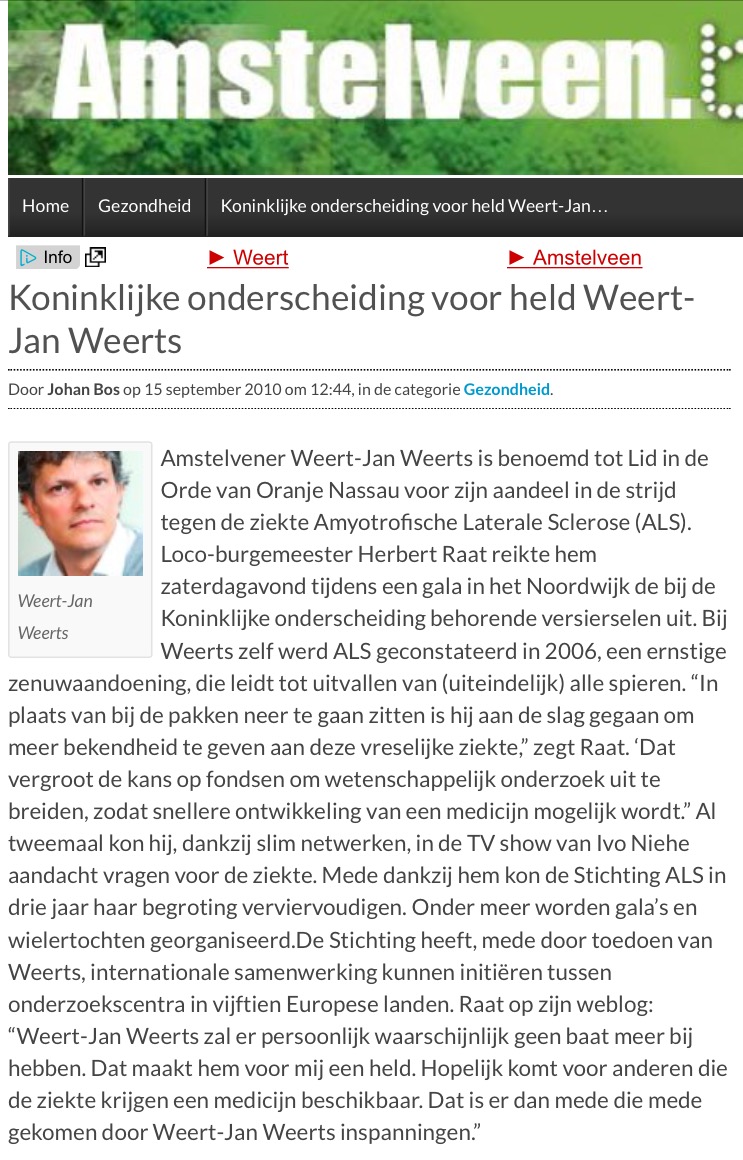 Bij Weert-Jan werd ALS geconstateerd in 2006. ALS is een zeer ernstige zenuwaandoening die leidt tot uitvallen van (uiteindelijk) alle spieren. In plaats van bij de pakken neer te gaan zitten is Weert-Jan aan de slag gegaan om meer bekendheid te geven aan deze vreselijke ziekte.