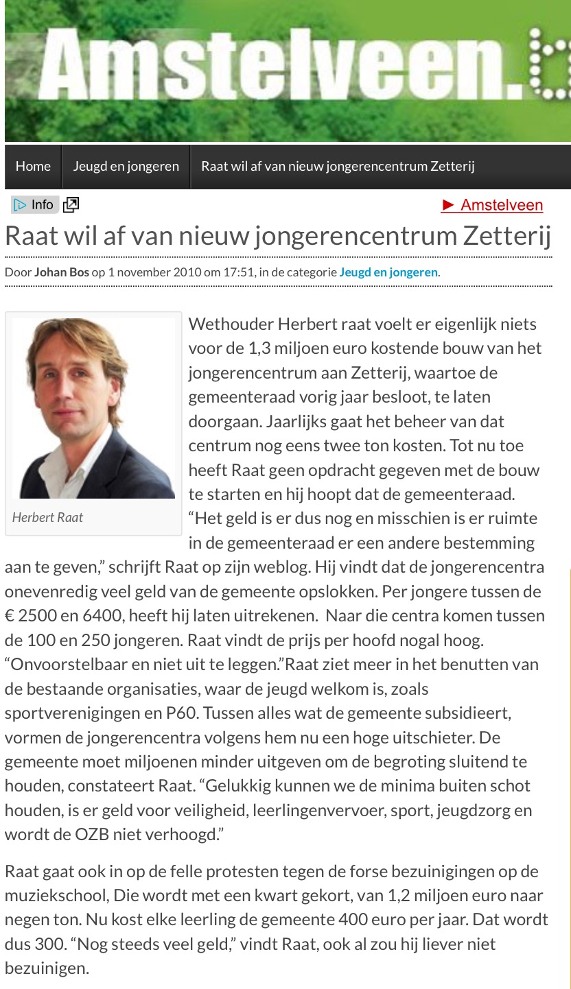Daarom wil ik ander beleid en het geld meer inzetten in bestaande voorzieningen zoals sportverenigingen, P60 en andere plekken waar jongeren komen. Toch heeft de gemeenteraad vorig jaar besloten dat er nog een jongerencentrum bij moet komen: De Zetterij. Wij hebben in het college van B&W grote twijfels hierover.