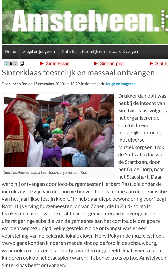 Veel mensen weten niet dat alleen door de inspanningen van Amstelveners zoals De heren Harry Tros, Van der Horst, Van Stal en andere vrijwilligers Sinterklaas zo hartelijk ontvangen kan worden in Amstelveen. Fantastisch voor alle kinderen, ouders en grootouders. Ook thuis waren mijn dochters reuze trots. De politiek met al dat vergaderen en veel avonden weg is vaak vervelend voor ze, maar Sinterklaas ontvangen maakt een hoop goed!