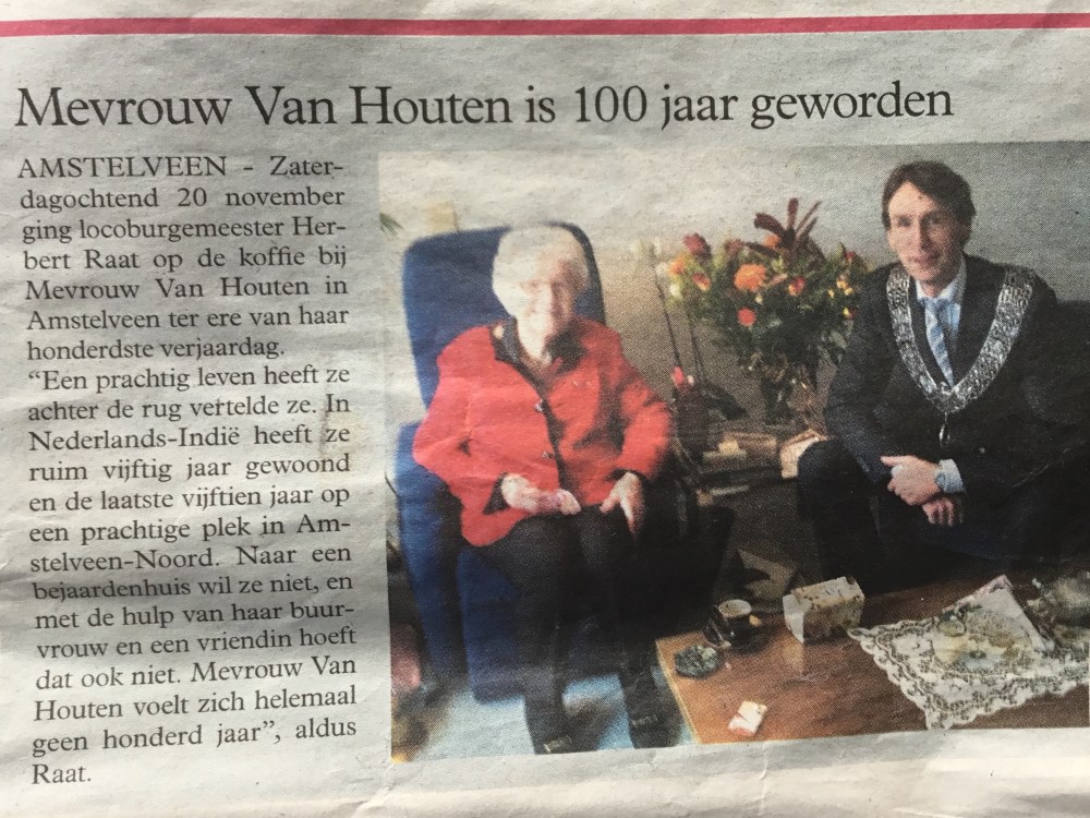 Een prachtig leven heeft ze achter de rug vertelde ze. In Nederlands-Indie heeft ze ruim 50 jaar gewoond en de laatste 15 jaar op een prachtige plek in Amstelveen-Noord. Naar een bejaardenhuis wil ze niet, en met de hulp van haar buurvrouw en een vriendin hoeft dat ook niet. Mevrouw Van Houten voelt zich helemaal geen 100 jaar zei haar vriendin toen ze me uitliet bij de deur en dat is maar goed ook.