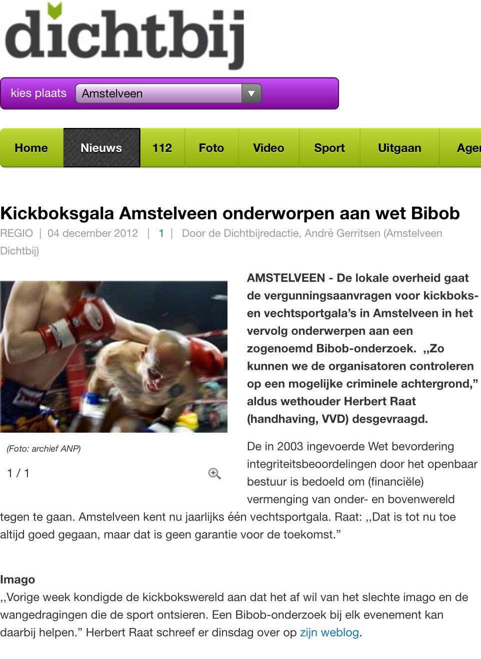 De in 2003 ingevoerde wet Bibob is bedoeld om vermenging van onderwereld en bovenwereld tegen te gaan. Amstelveen kent nu jaarlijks een ‘vechtsportgala‘ en dat is tot nu toe altijd goed gegaan, maar dat is geen garantie voor de toekomst.