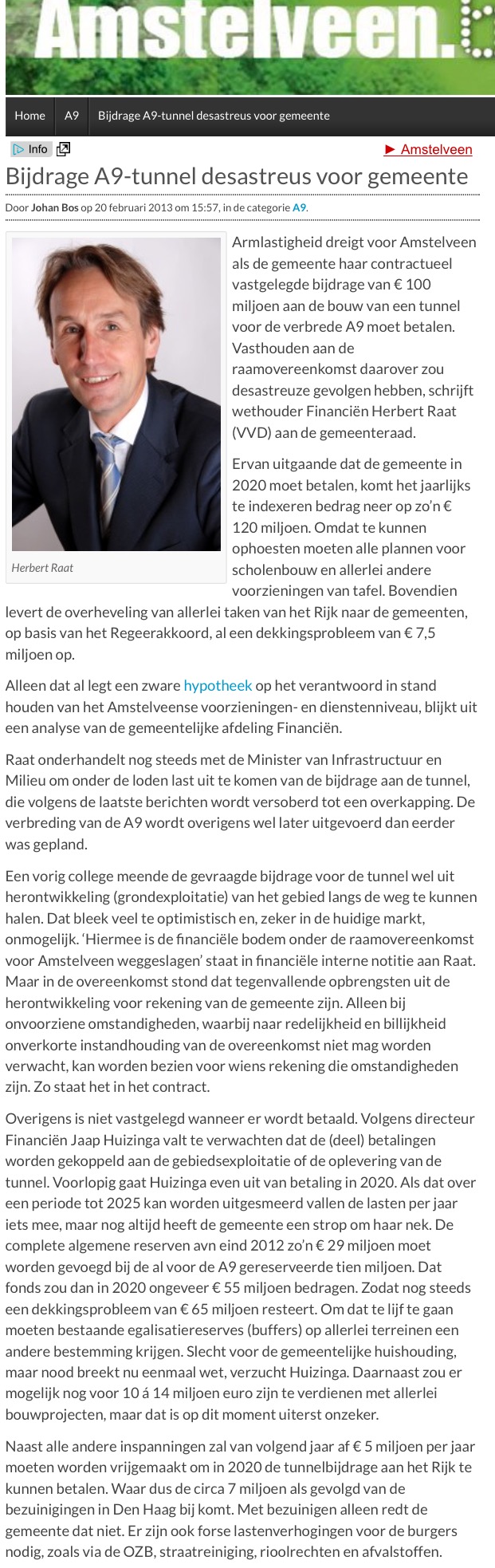Het rijk wil de A9 verbreden en Amstelveen heeft in 2007 een bijdrage van € 100 miljoen toegezegd voor een ondertunneling. De bedoeling was om dit te betalen uit grondopbrengsten maar anno 2013 levert dat niets (lees HIER) meer op.