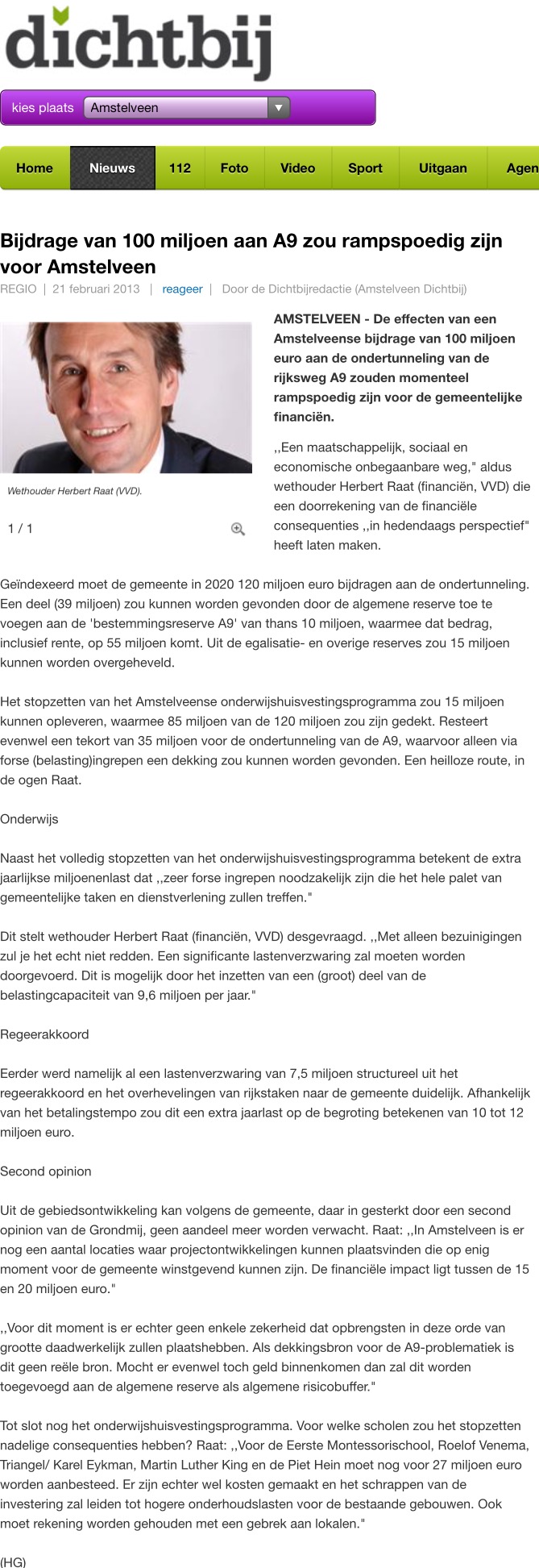 Overigens is er na een jaar onderhandelen een onderhandelingsresultaat met het Rijk over andere oplossingen. Het enige wat ik daar nu over kan zeggen nu is dat het Amstelveense college van B&W akkoord is. Het ligt nu bij de minister Melanie Schultz en we moeten afwachten tot zij er een uitspraak over doet. Ik hoop dat er nog dit jaar duidelijkheid uit Den Haag komt.
