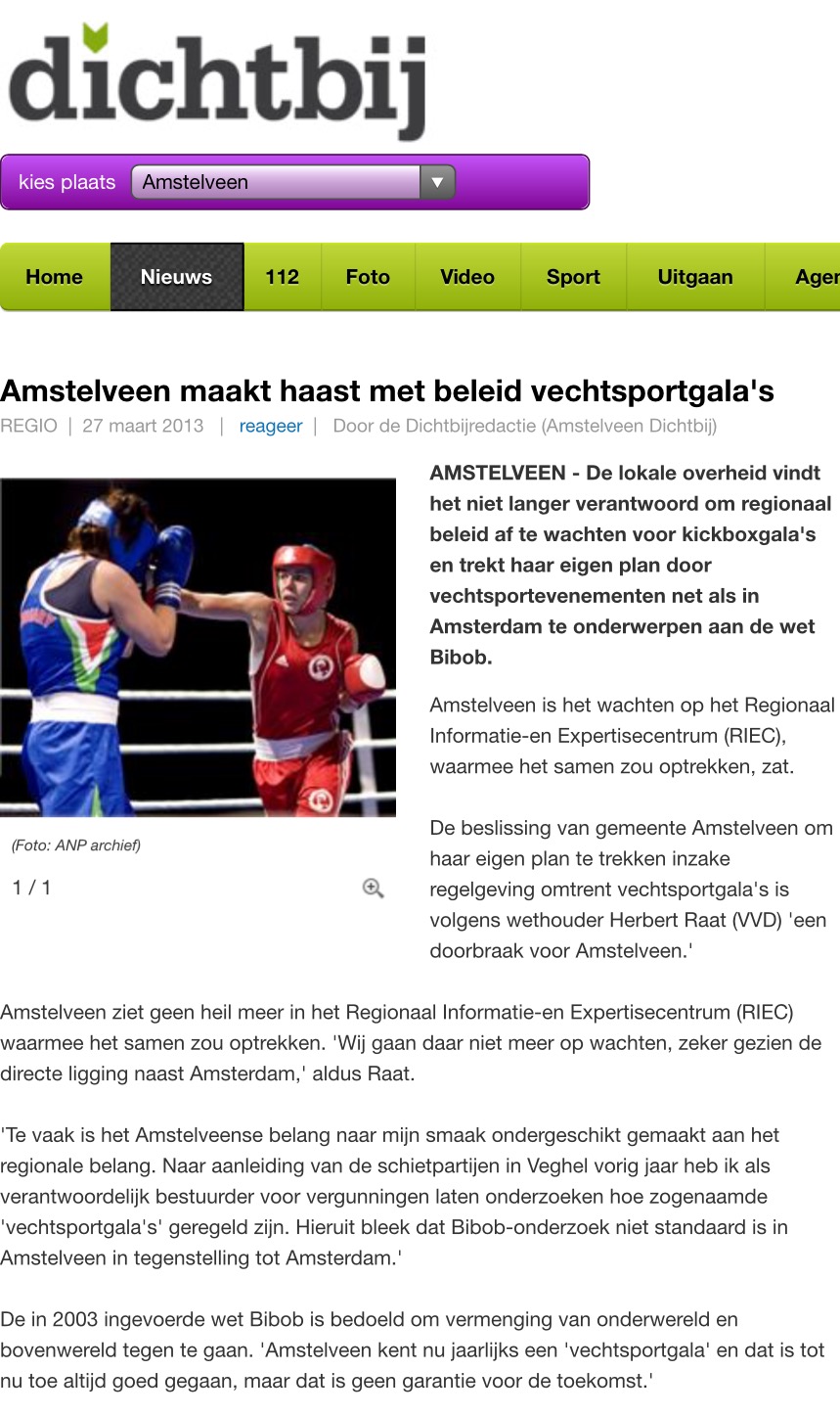 De in 2003 ingevoerde wet Bibob is bedoeld om vermenging van onderwereld en bovenwereld tegen te gaan. Amstelveen kent nu jaarlijks een ‘vechtsportgala‘ en dat is tot nu toe altijd goed gegaan, maar dat is geen garantie voor de toekomst.