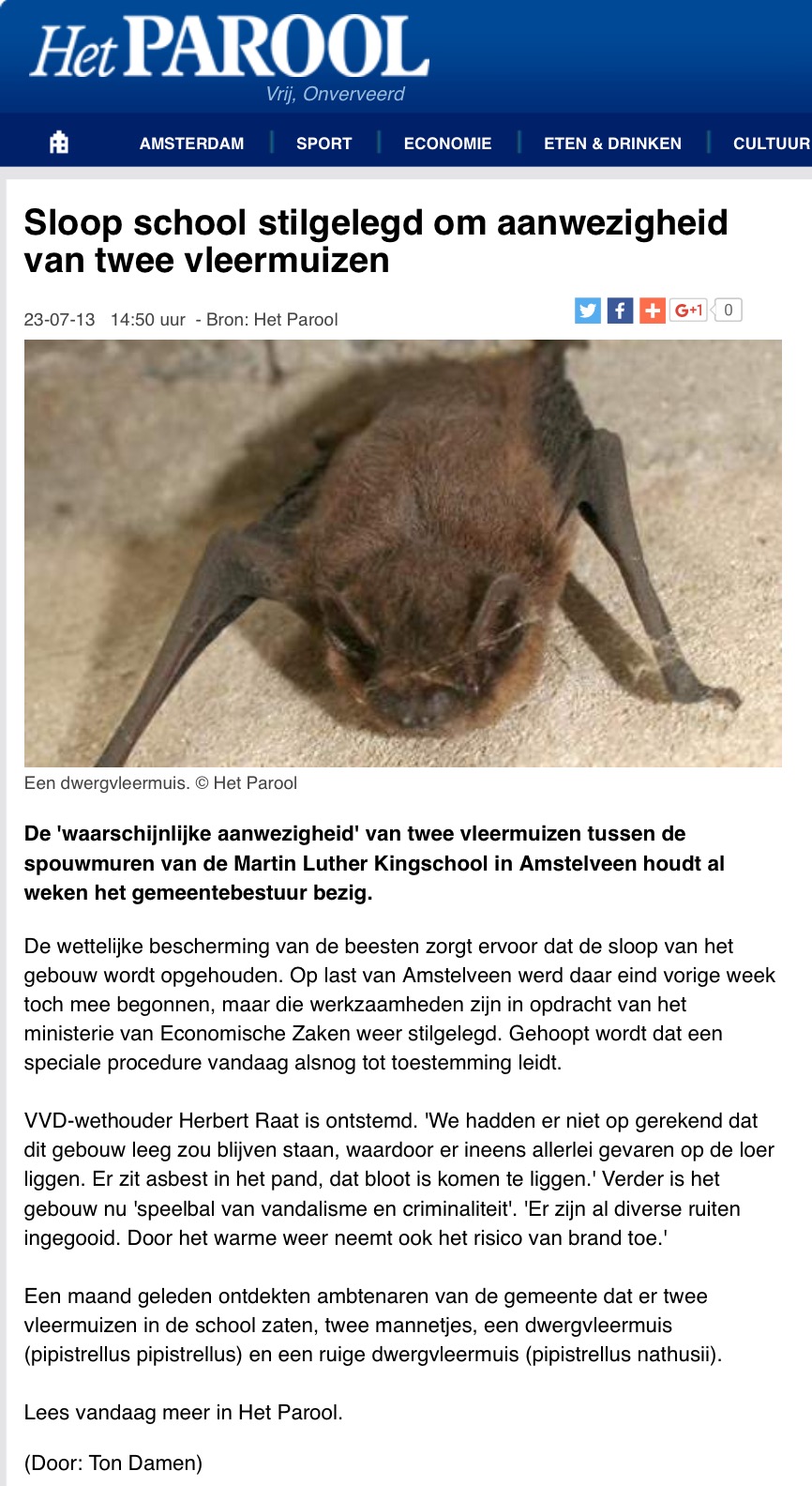 Update: 17-7-2013: De partij voor de dieren Amsterdam is een actie begonnen tegen onze beslissing om veiligheid en de belangen van 300 kinderen boven 2 vleermuizen te stellen.