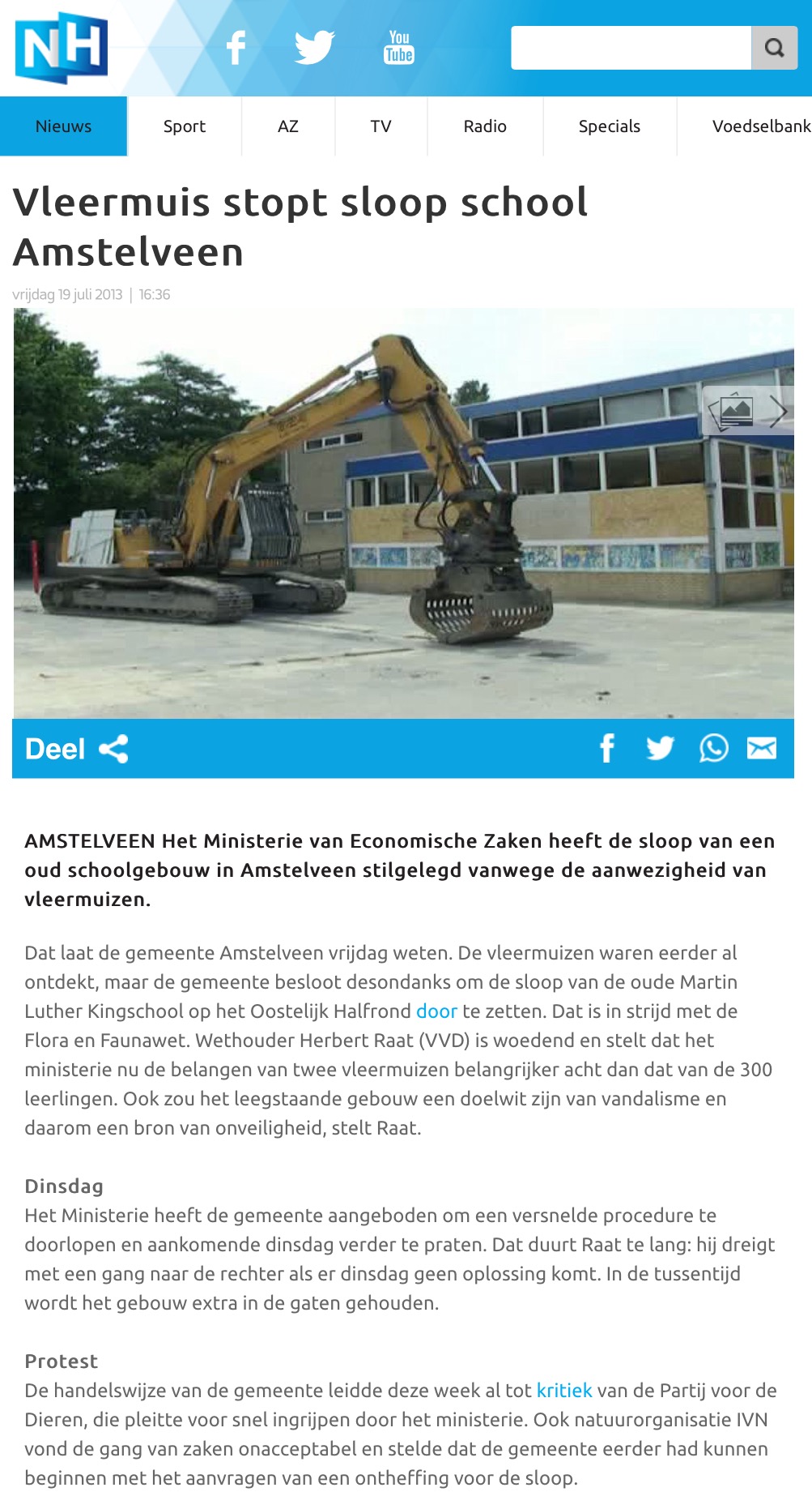 De directeur Francesca Deenik van de Maarten Luther Kingschool staan achter de beslissing. We hebben het sloopbedrijf gevraagd zo behoedzaam mogelijk te werk te gaan om de vleermuizen te laten uitvliegen. Ook hebben we vleermuiskasten op laten hangen aan het gymnastieklokaal. Daarbij komen er in Amstelveen extra kasten op gemeentelijke gebouwen. We doen er alles aan om ook de vleermuizen de ruimte te geven.