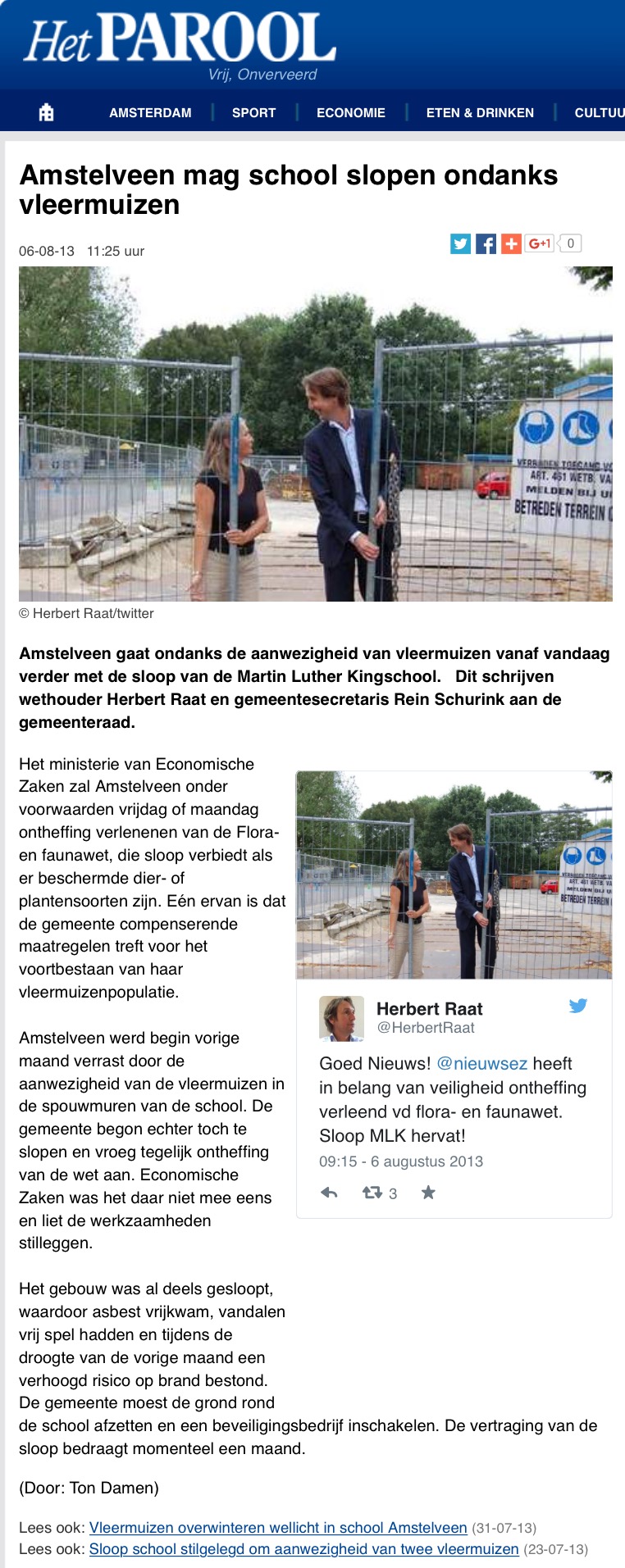 De directeur Francesca Deenik van de Maarten Luther Kingschool staan achter de beslissing. We hebben het sloopbedrijf gevraagd zo behoedzaam mogelijk te werk te gaan om de vleermuizen te laten uitvliegen. Ook hebben we vleermuiskasten op laten hangen aan het gymnastieklokaal. Daarbij komen er in Amstelveen extra kasten op gemeentelijke gebouwen. We doen er alles aan om ook de vleermuizen de ruimte te geven.