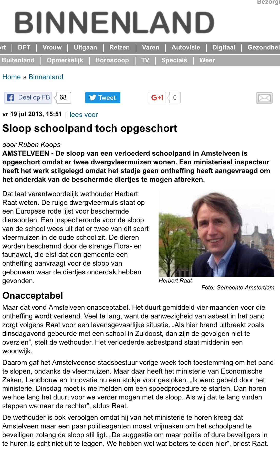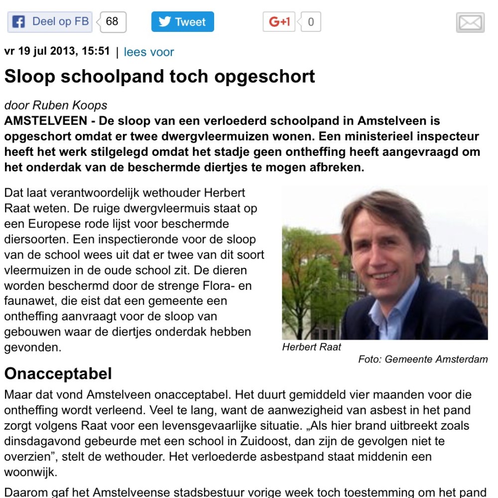 2013-19-7;De Telegraaf; wethouder Herbert Raat over opstelling ministerie/ vleermuizen/ sloop/ Amstelveen Dit delen:TweetVind-ik-leuk Aan het laden...