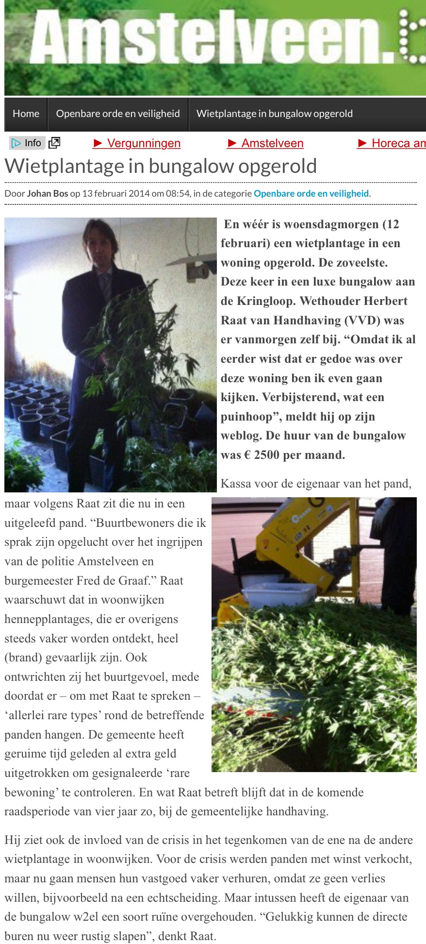 Zeker in woonwijken is de teelt van hennep zeer (brand) gevaarlijk. Ook ontwricht zo’n pand met allerlei rare types het veilige buurtgevoel. We hebben in Amstelveen extra geld uitgetrokken om te controleren op ‘rare bewoning’. Dit blijft wat mij betreft de volgende collegeperiode ook een prioriteit bij de gemeentelijke handhaving.