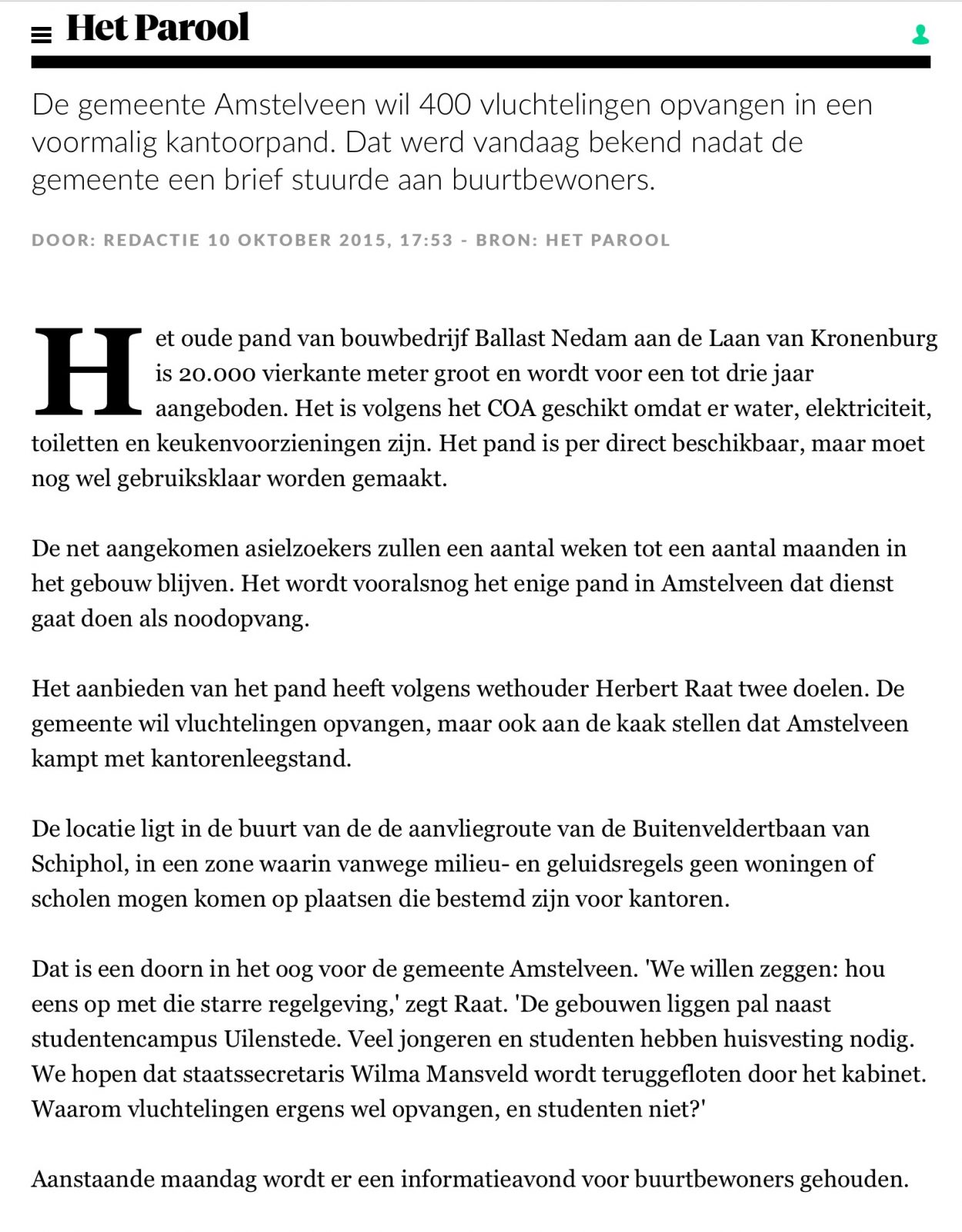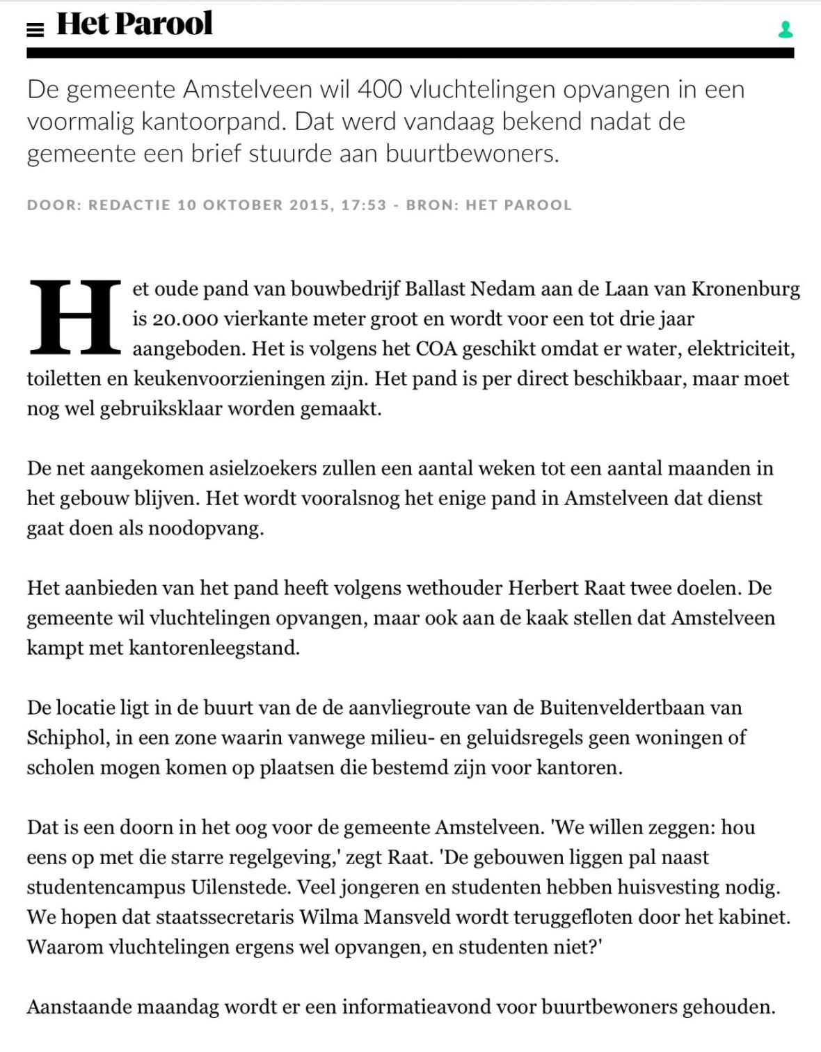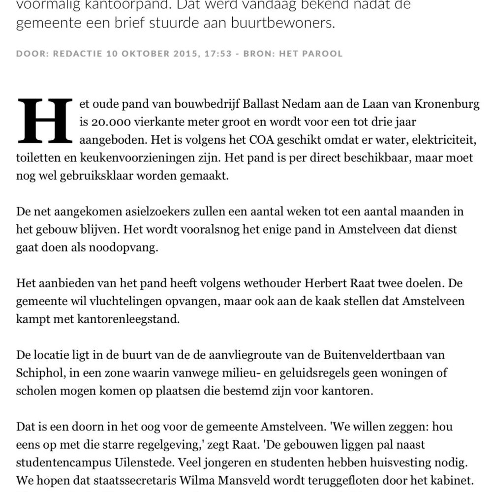 2015-10-10; Het Parool: Herbert Raat over opvang vluchtelingen en Kronenburg Amstelveen Dit delen:TweetVind-ik-leuk Aan het laden...