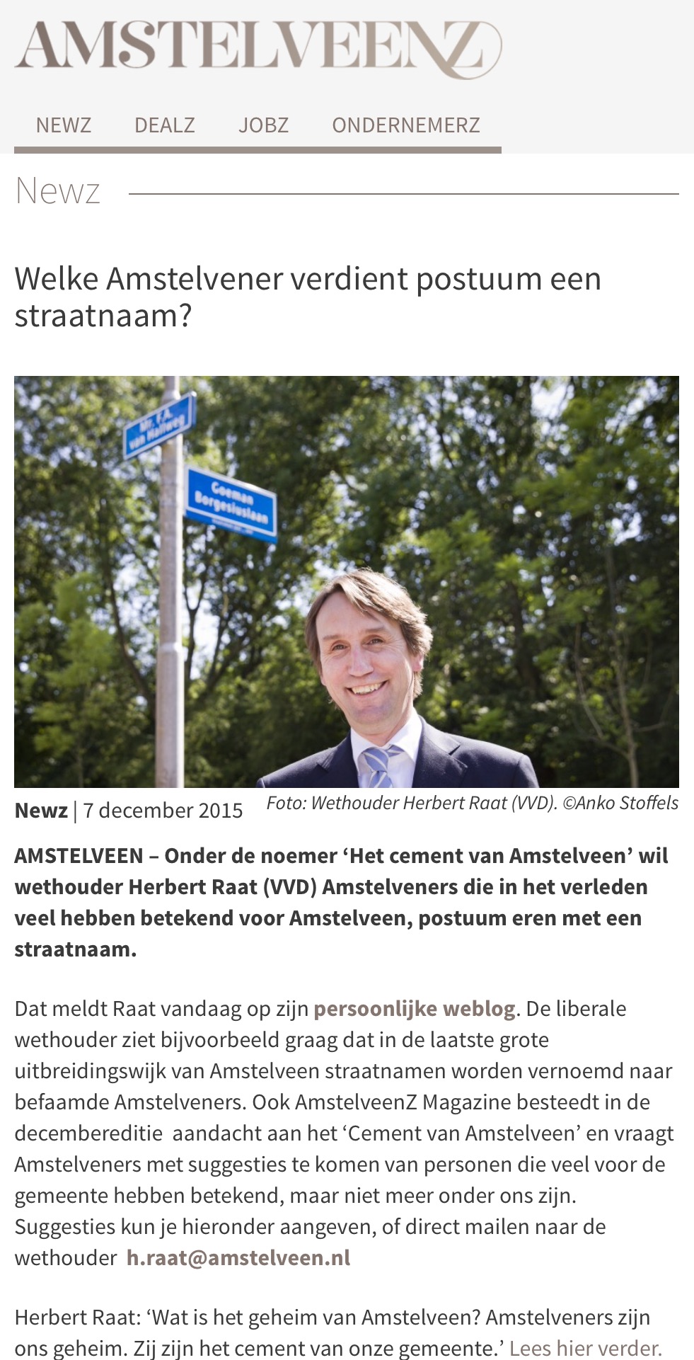 2015-7-5 AmstelveenZ; Herbert Raat over straatnamen voor bekende en betekenisvolle Amstelveners Dit delen:TweetVind-ik-leuk Aan het laden...