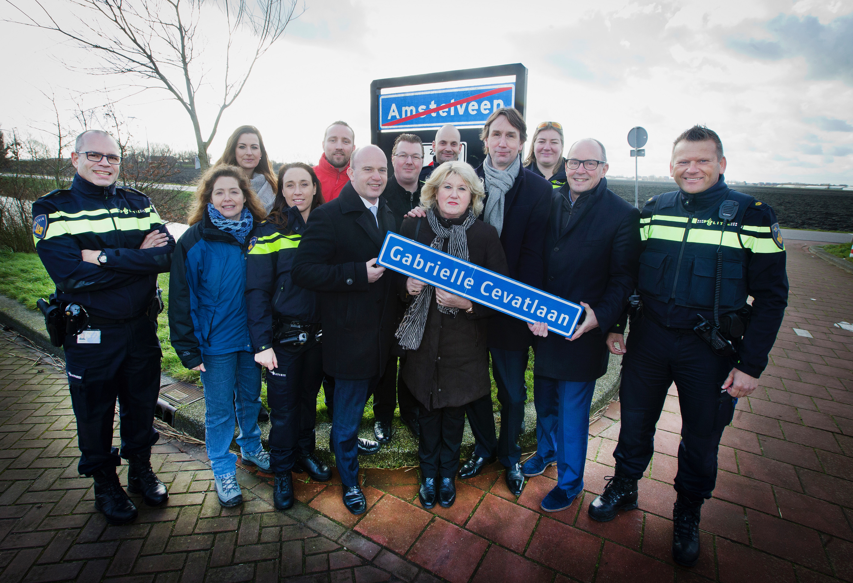 2016-Amstelveen De moeder van de doodgeschoten politieagente Cabrielle Cevat, heeft uit handen van Wethouder Herbert Raat, Peter Bot en Jeroen Brandes een straatnaambord ontvangen van de nog aan te leggen Cabrielle Cevatlaan.
