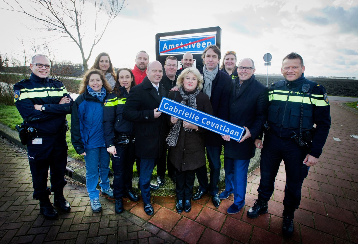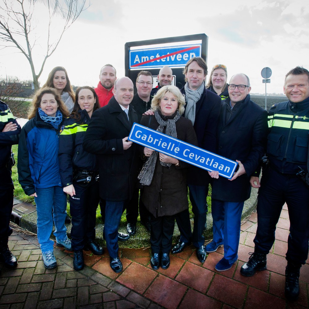2016-Amstelveen De moeder van de doodgeschoten politieagente Cabrielle Cevat, heeft uit handen van Wethouder Herbert Raat, een straatnaambord ontvangen van de nog aan te leggen Cabrielle Cevatlaan.