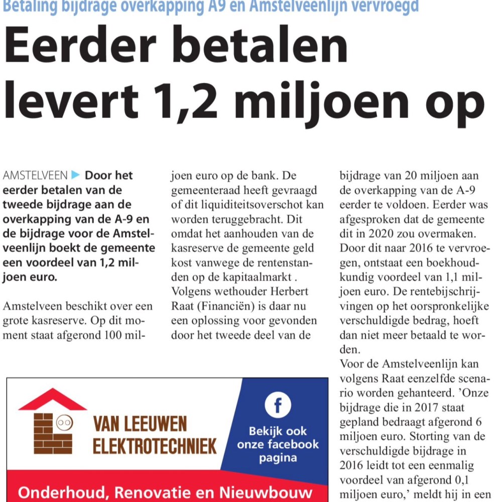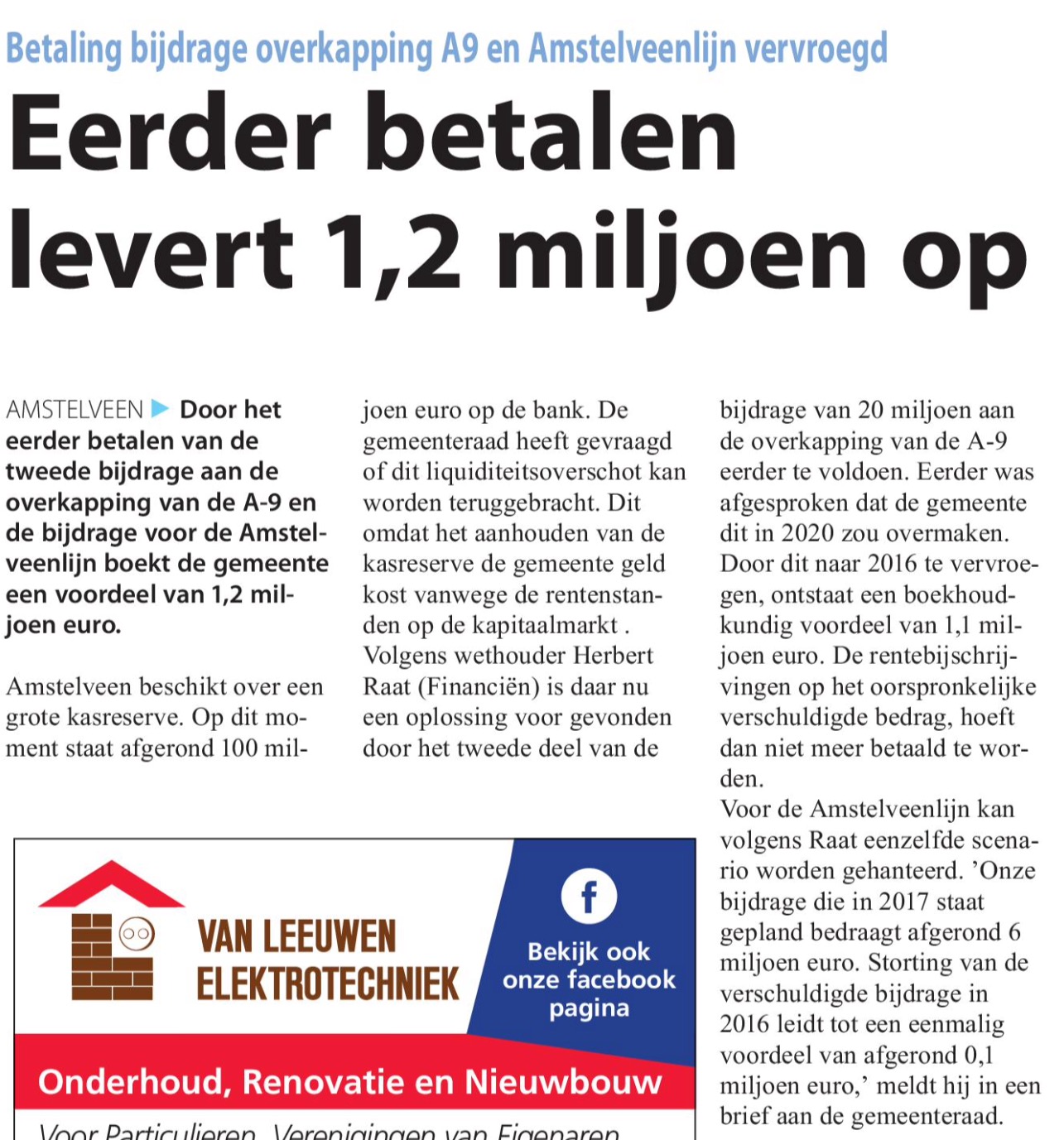 2016-7-9 Amstelveens Nieuwsblad; wethouder Herbert Raat over eerder betalen A9 levert geld op Dit delen:TweetVind-ik-leuk Aan het laden...