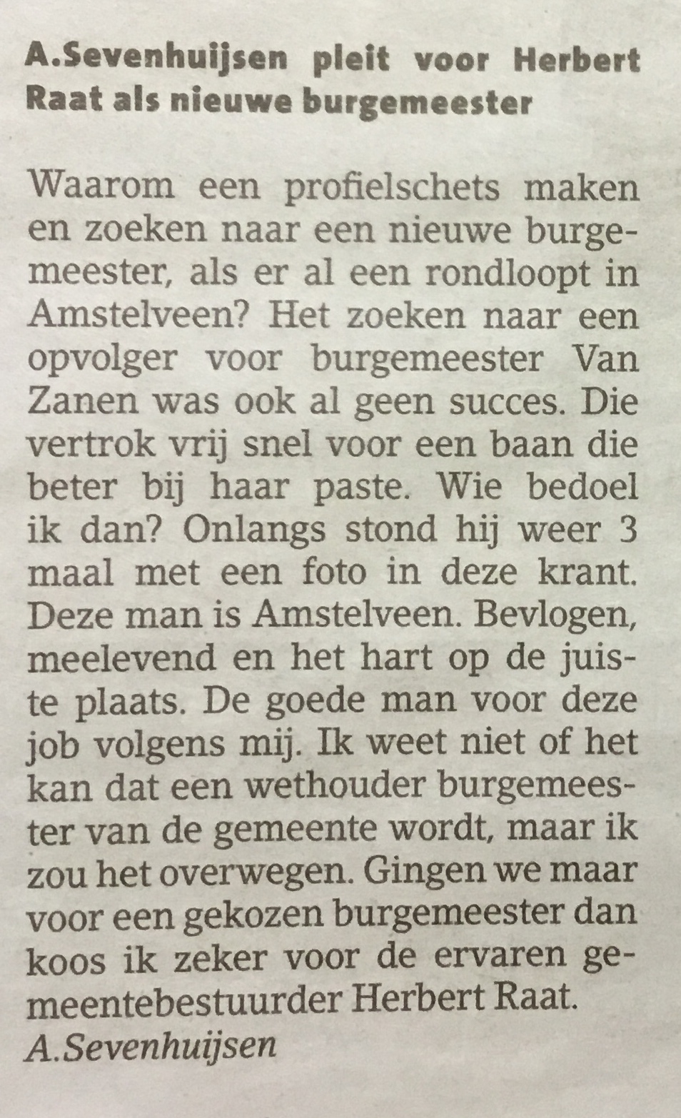 2018-21-11 Amstelveens Nieuwsblad ingezonden brief van A. Sevenhuijzen over nieuwe burgemeester Amstelveen Dit delen:TweetVind-ik-leuk Aan het laden...