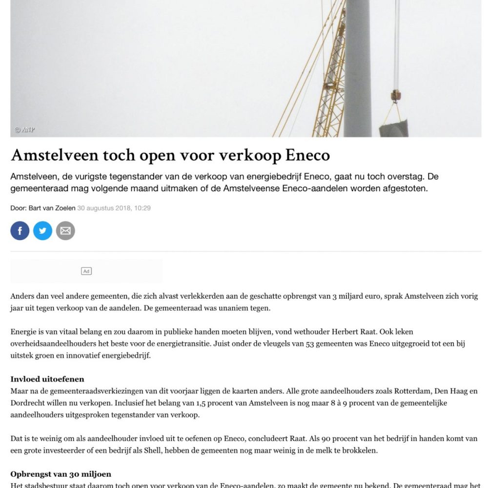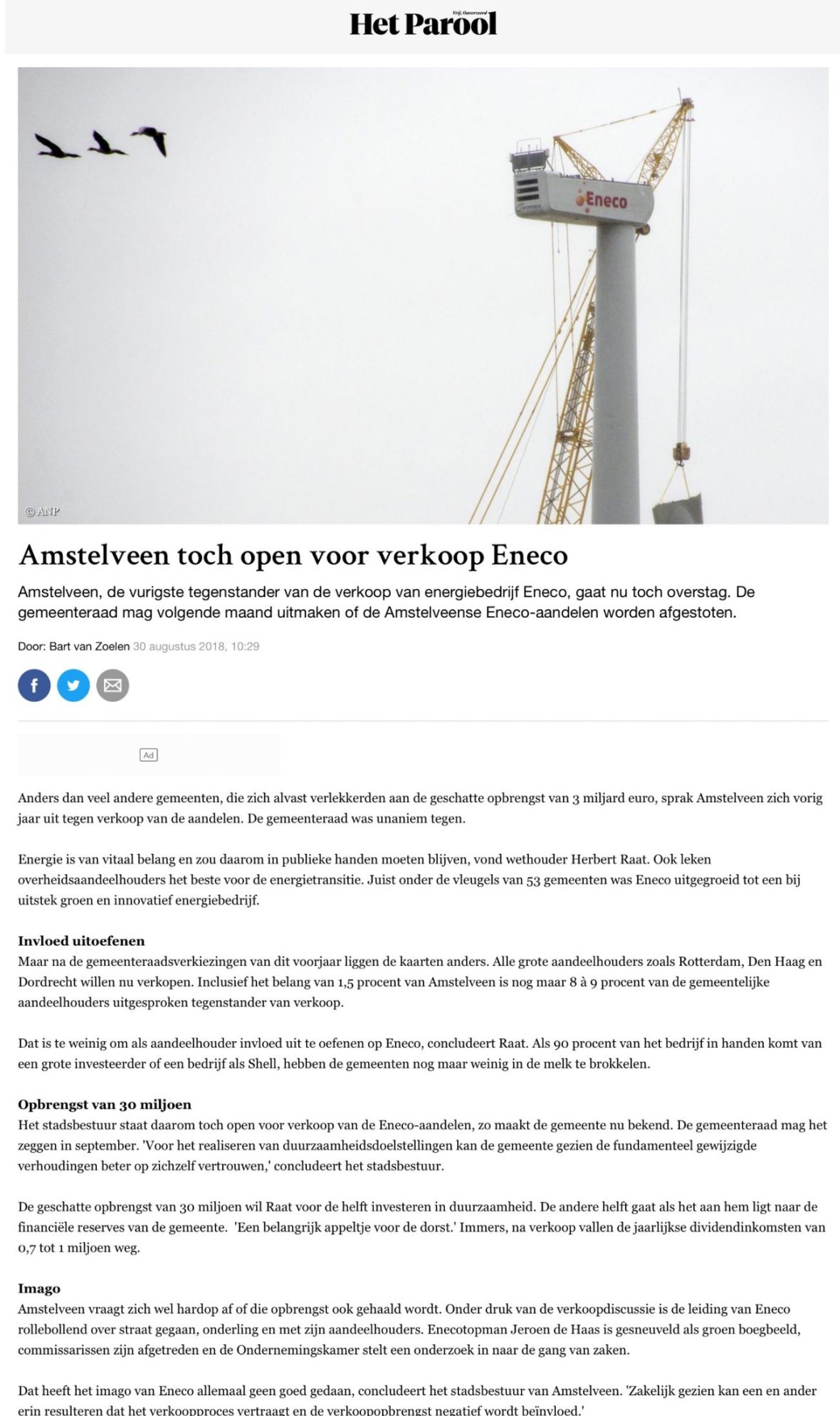 2018-30-8 Het Parool Amstelveen Verkoop Eneco
