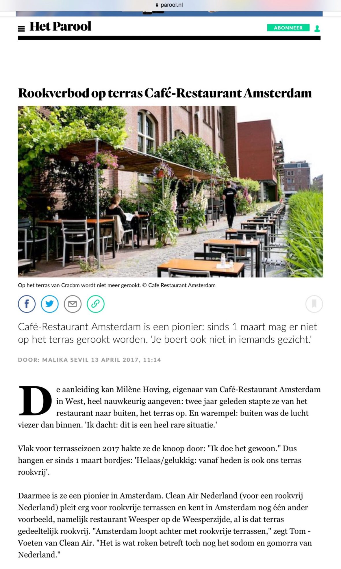 2017-13-4 Het Parool over rookvrij terras restaurant Amsterdam 1 van 2 Dit delen:TweetVind-ik-leuk Aan het laden...
