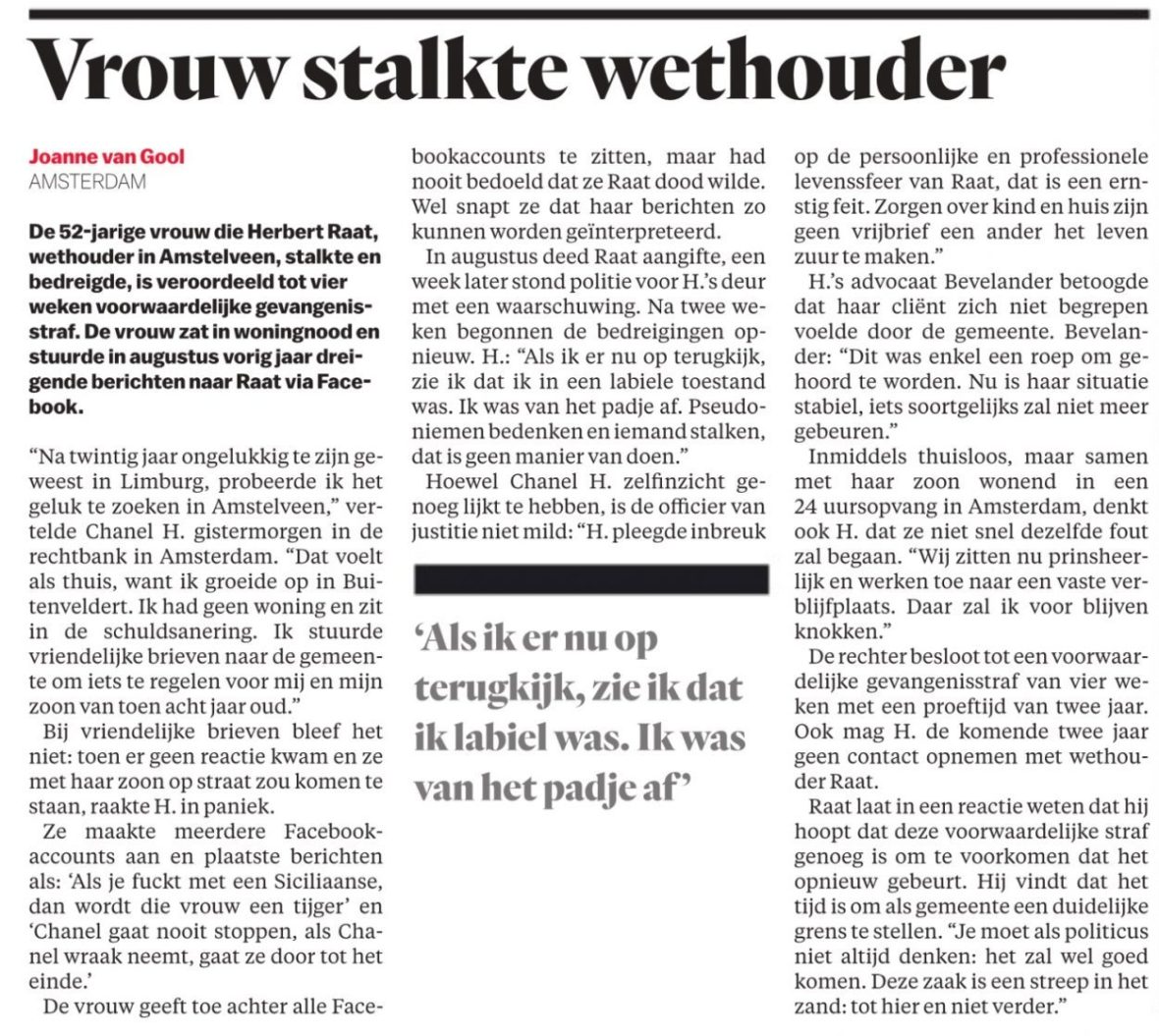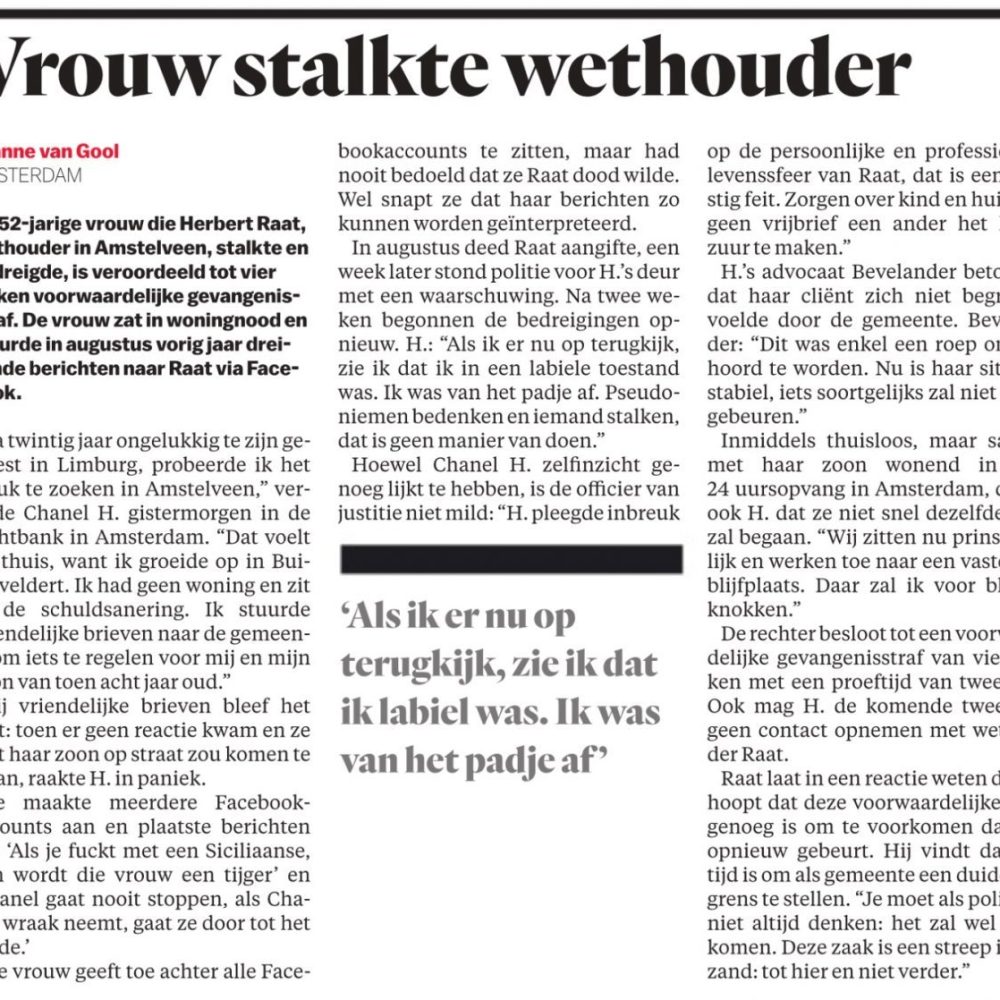 2019-27-3 Het Parool, journaliste Joanne van Gool over uitspraak rechter van een vrouw die wethouder Herbert Raat stalkte Dit delen:TweetVind-ik-leuk Aan het laden...