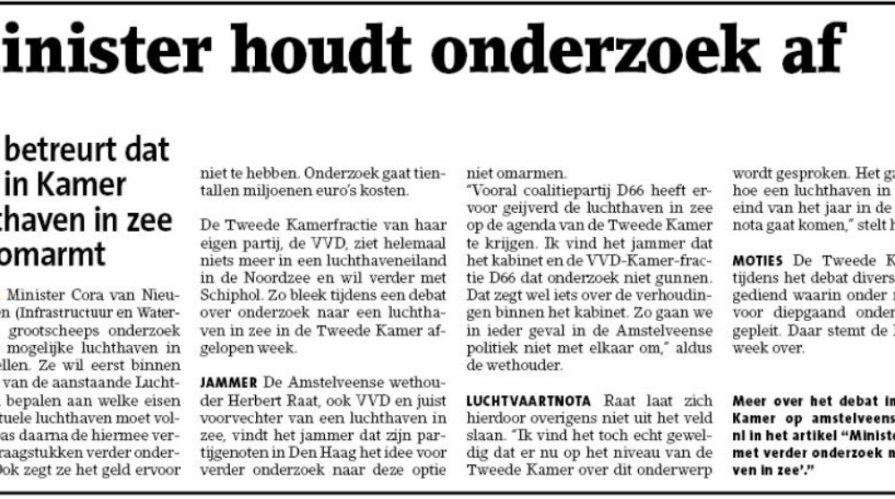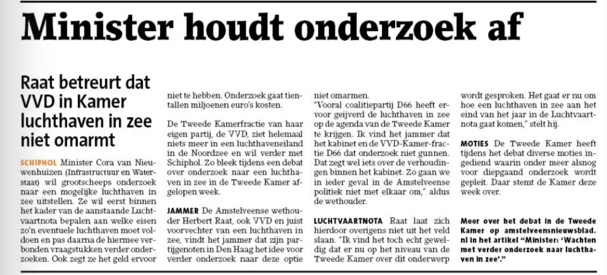 2019-16-10; Amstelveens Nieuwsblad; Herbert Raat over opstelling minister Cora van Nieuwenhuizen over onderzoek naar een luchthaven in zee. Dit delen:TweetVind-ik-leuk Aan het laden...