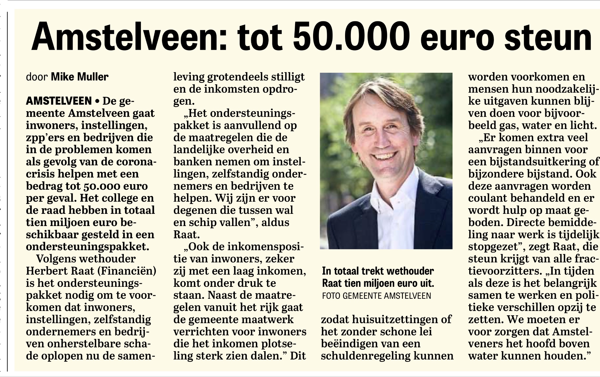 31-3-2020:De Telegraaf: Herbert Raat over fonds Amstelveen voor inwoners, ondernemers en instellingen vanwege Corona 1 van 2 Dit delen:TweetVind-ik-leuk Aan het laden...