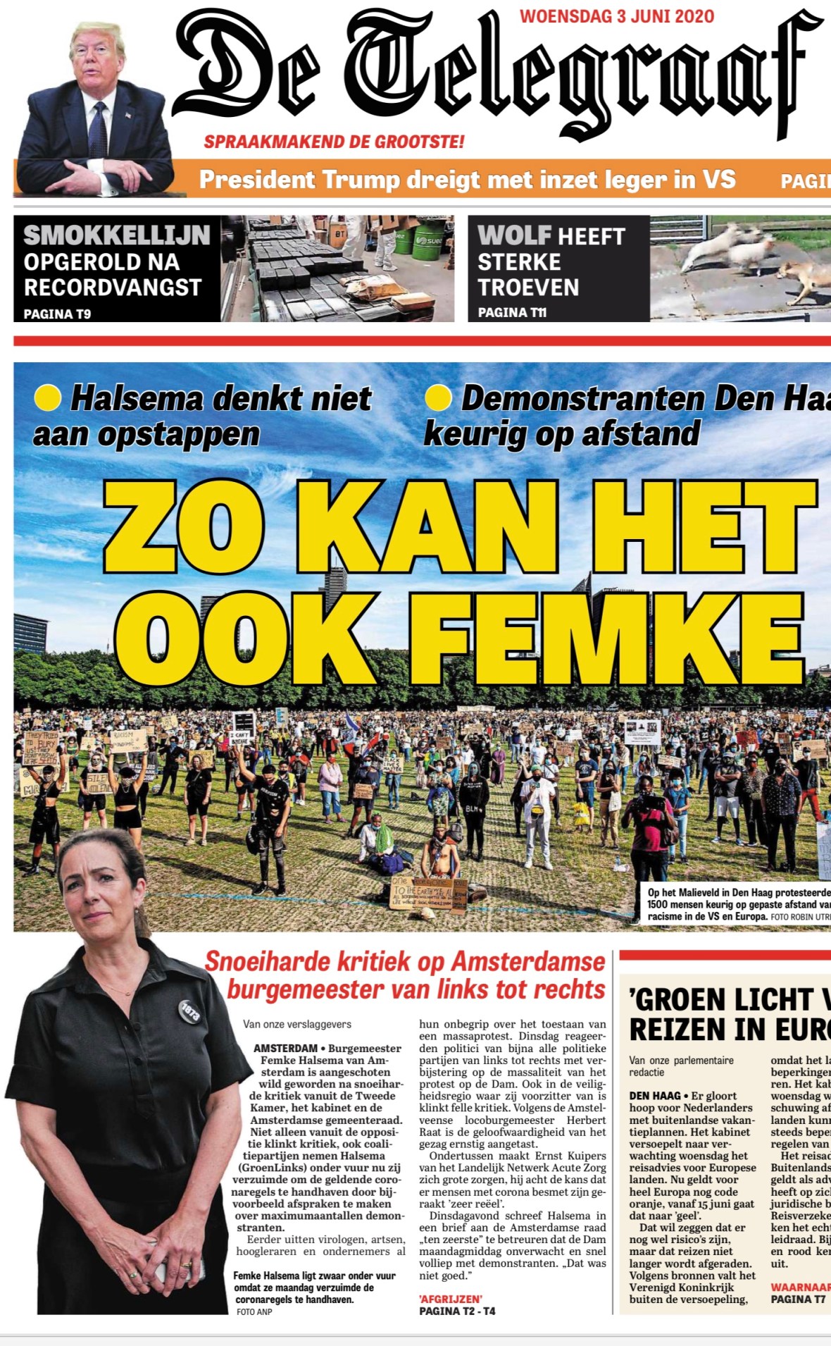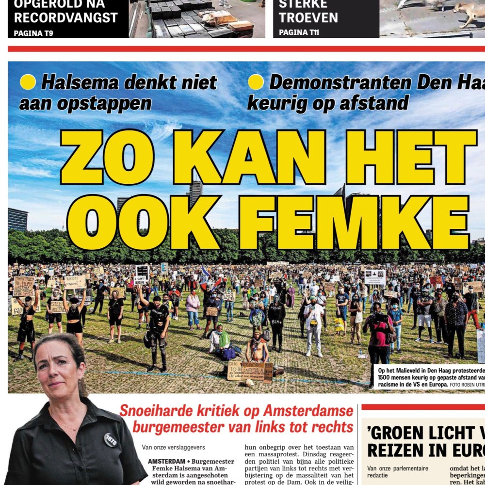3-6-2020: Voorpagina De Telegraaf; Herbert Raat over optreden burgemeester Femke Halsema bij demonstratie op de Dam Dit delen:TweetVind-ik-leuk Aan het laden...