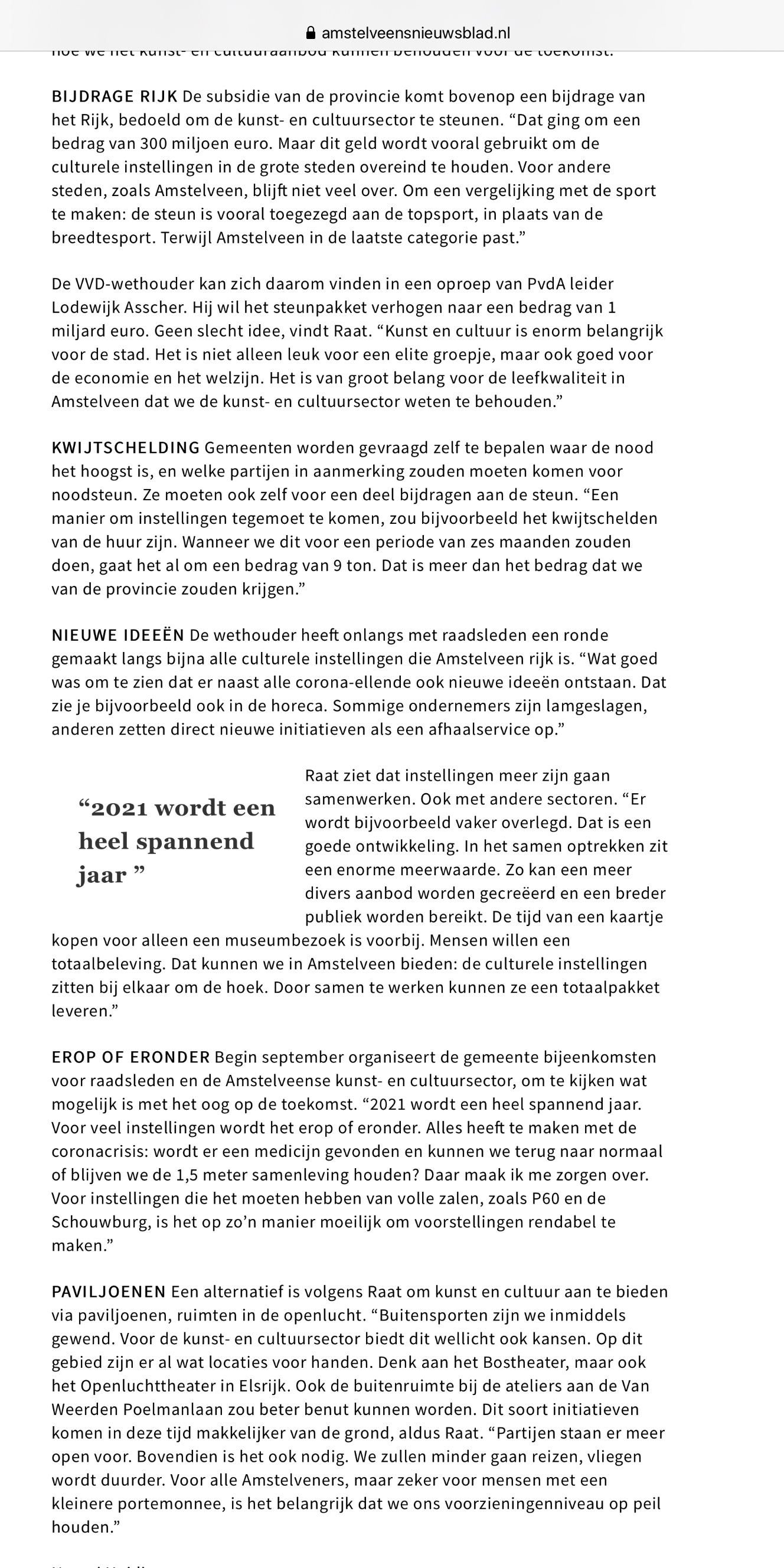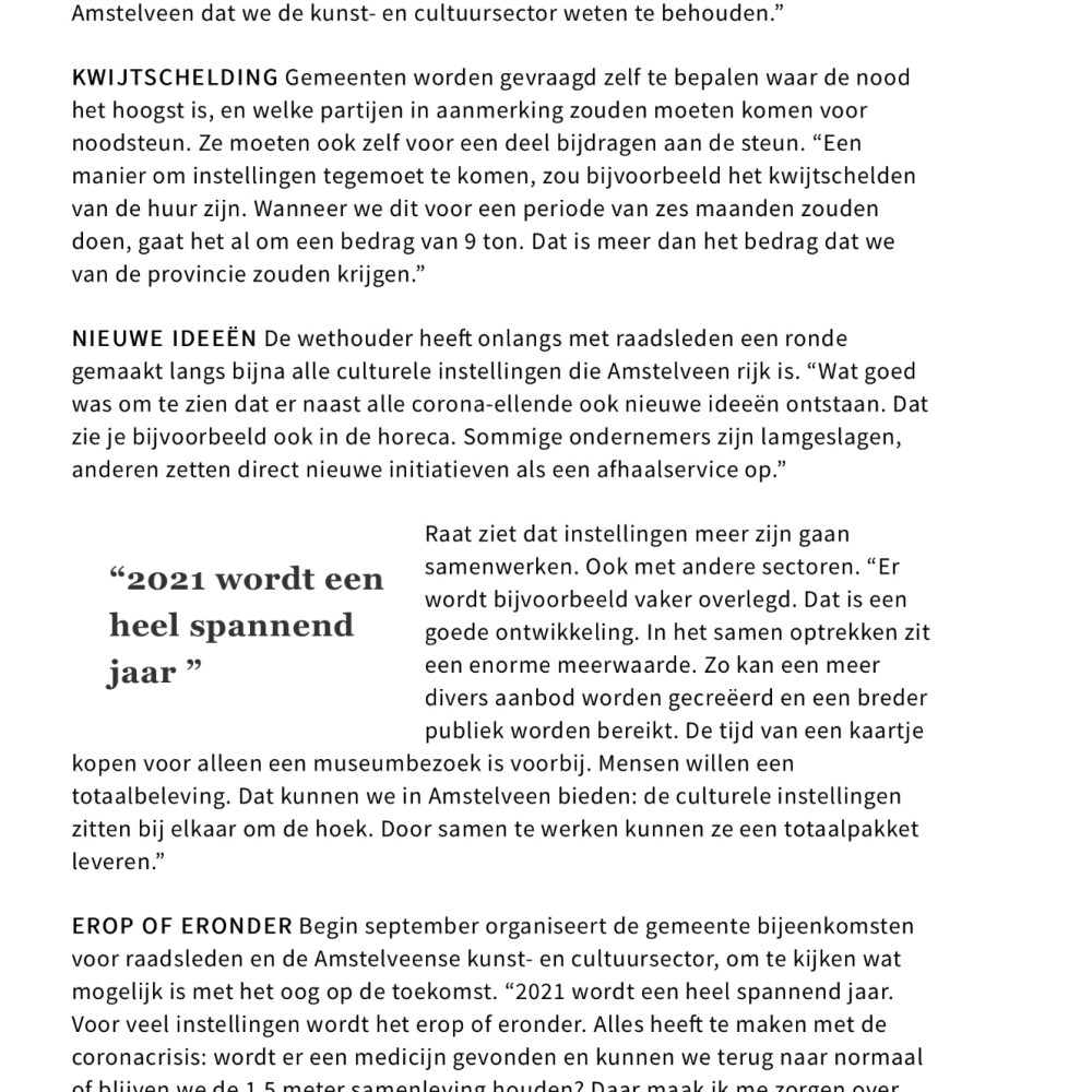 15-7-2020; Het Amstelveens Nieuwsblad; digitale versie 2 van 2: interview wethouder Herbert Raat door Naomi Heidinga de toekomst van kunst en cultuur in Amstelveen Dit delen:TweetVind-ik-leuk Aan het laden...