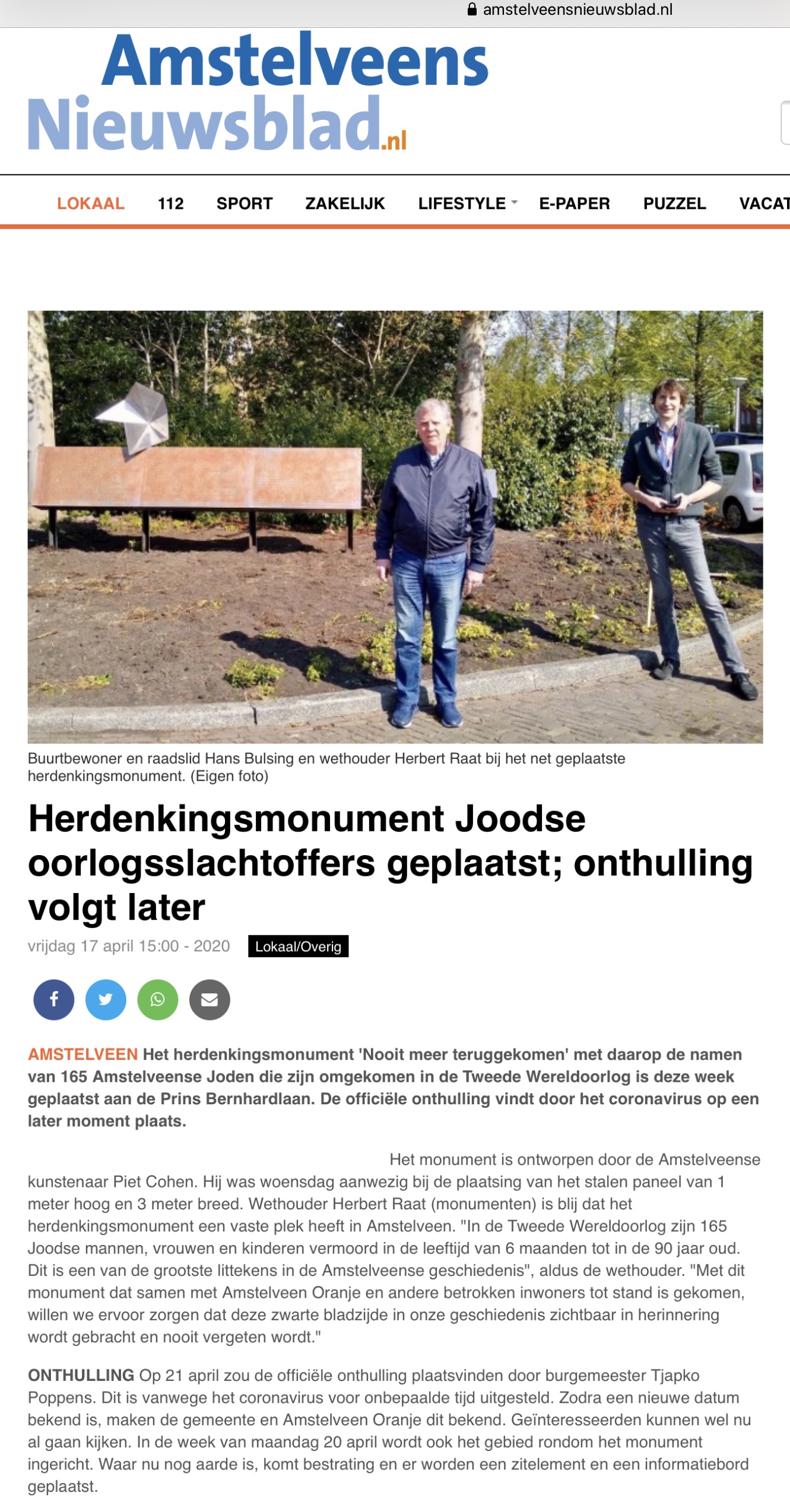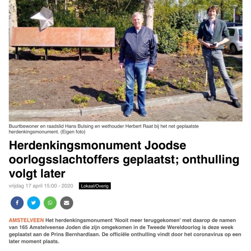 22-4-2010: Amstelveens Nieuwsblad; Hans Bulsing en Herbert Raat bij monument Joodse slachtoffers Amstelveen-internetversie Dit delen:TweetVind-ik-leuk Aan het laden...