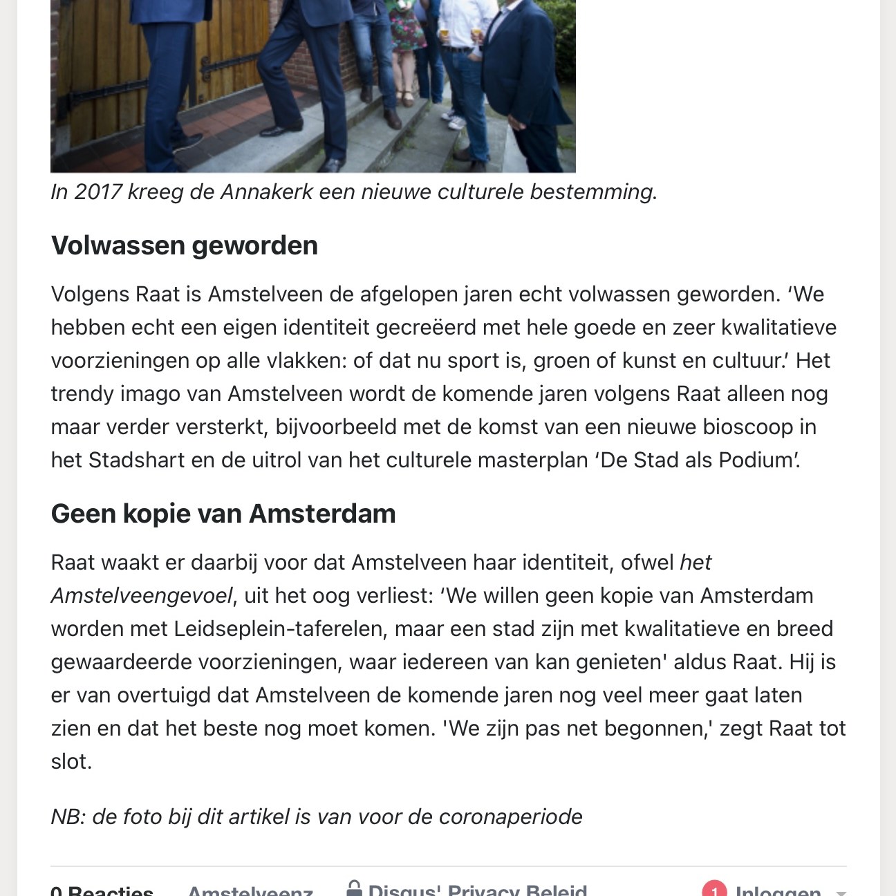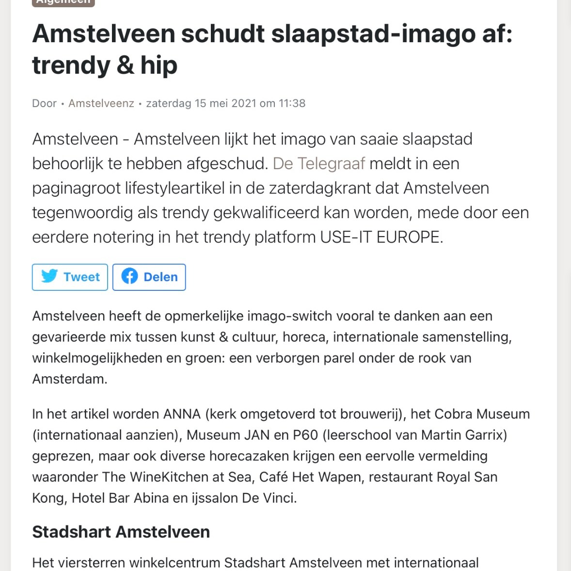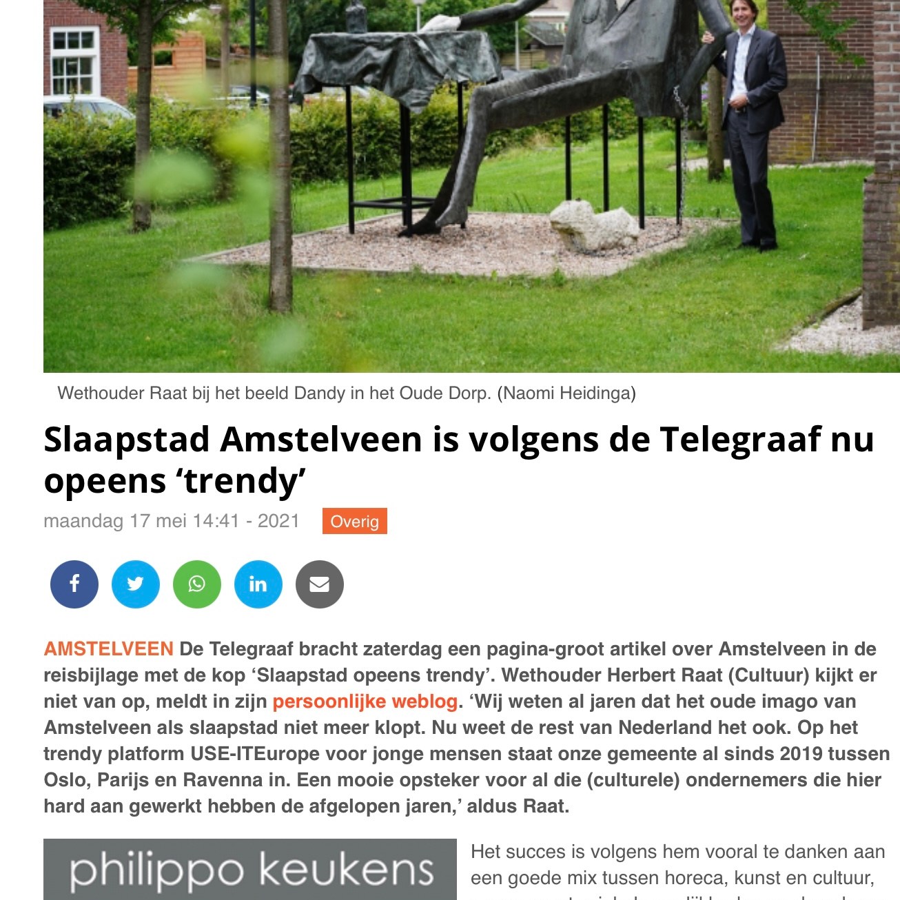 Vandaag kopte de Telegraaf; ‘Slaapstad opeens trendy’. Wij weten al jaren dat het oude imago van Amstelveen als slaapstad niet meer klopt. Nu weet de rest van Nederland het ook. Op het trendy platform USE-ITEurope (zie HIER) voor jonge mensen staat onze gemeente al sinds 2019 tussen Oslo, Parijs en Ravenna in. Een mooie opsteker voor al die (culturele) ondernemers die hier hard aan gewerkt hebben de afgelopen jaren.