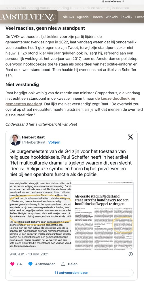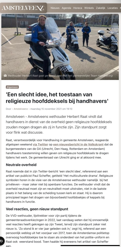 Uitzending van 1Amstelveen 19-2-2024: wethouder Herbert Raat over de neutraliteit van de overheid en daarom geen religieuze symbolen bij politie en handhaving