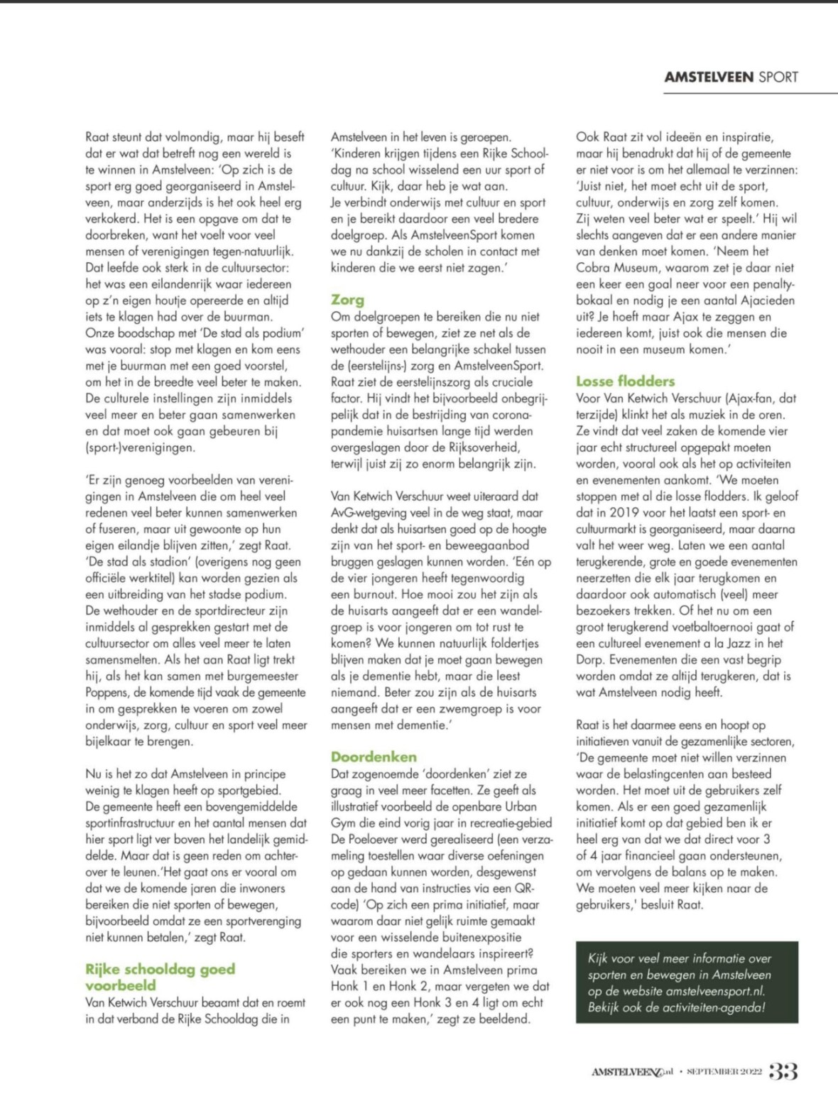 2022-september: interview Amstelveenz over sport Amstelveen: de stad als stadion wethouder Herbert Raat en Heleen Ketwich Verschuur directeur AmstelveenSport 2 van 2 Dit delen:TweetVind-ik-leuk Aan het laden...