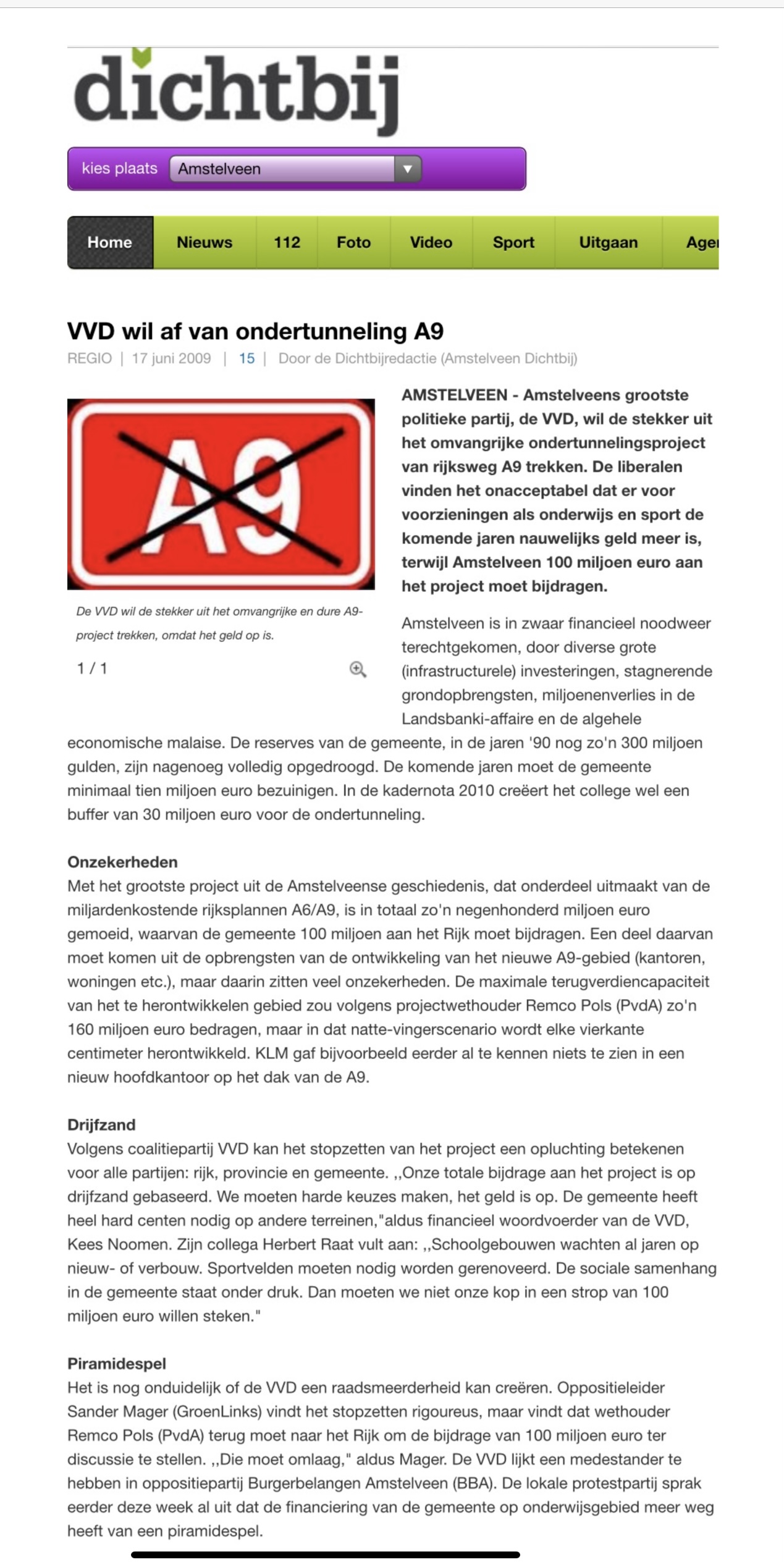 17-6-2009; Amstelveens Nieuwsblad; VVD-Kees Noomen Herbert Raat, stekker uit A9 tunnel omdat er voor onderwijs, sport en andere zeken geen geld meer is Dit delen:TweetVind-ik-leuk Aan het laden...