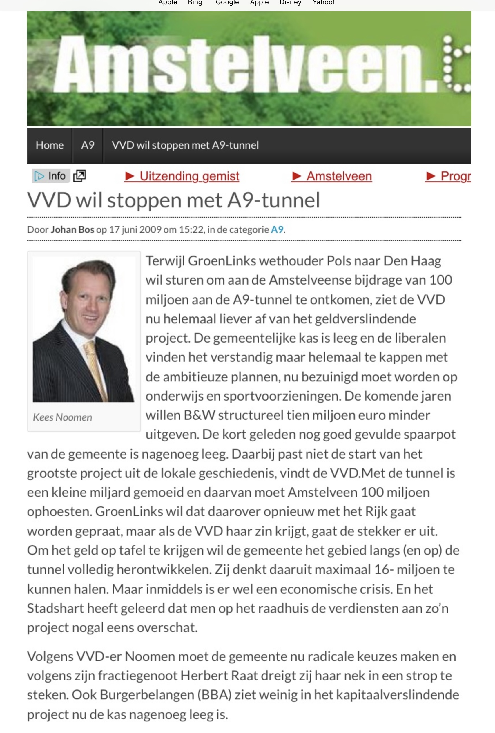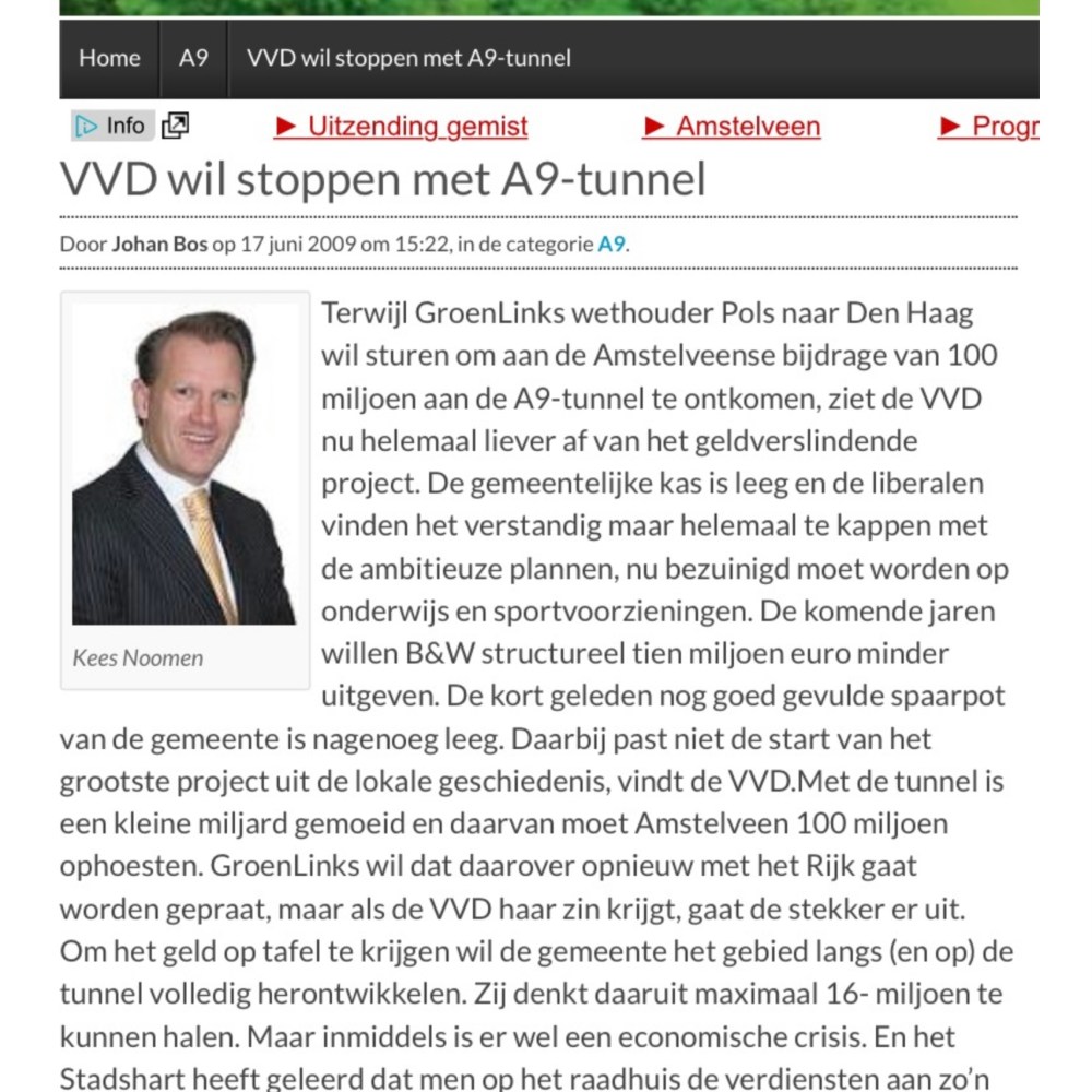 17 juni 2009; Amstelveen.Blog.nl; VVD stoppen met tunnel A9 omdat voorzieningen als sport en onderwijs het kind van de rekening zal zijn Dit delen:TweetVind-ik-leuk Aan het laden...