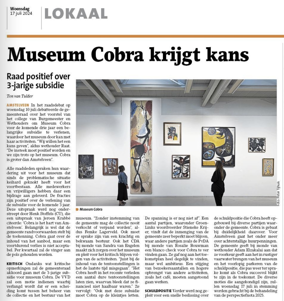 17-7-2024 Amstelveens Nieuwsblad over kans voor museum Cobra Dit delen:TweetVind-ik-leuk Aan het laden...