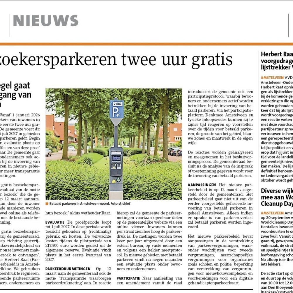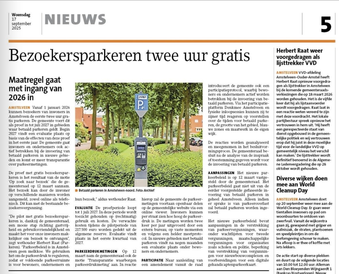 17-9-2025-Amstelveens Nieuwsbld-wethouder Herbert Raat VVD over 2 uur gratis voor parkeren bezoekers Dit delen:TweetVind-ik-leuk Aan het laden...