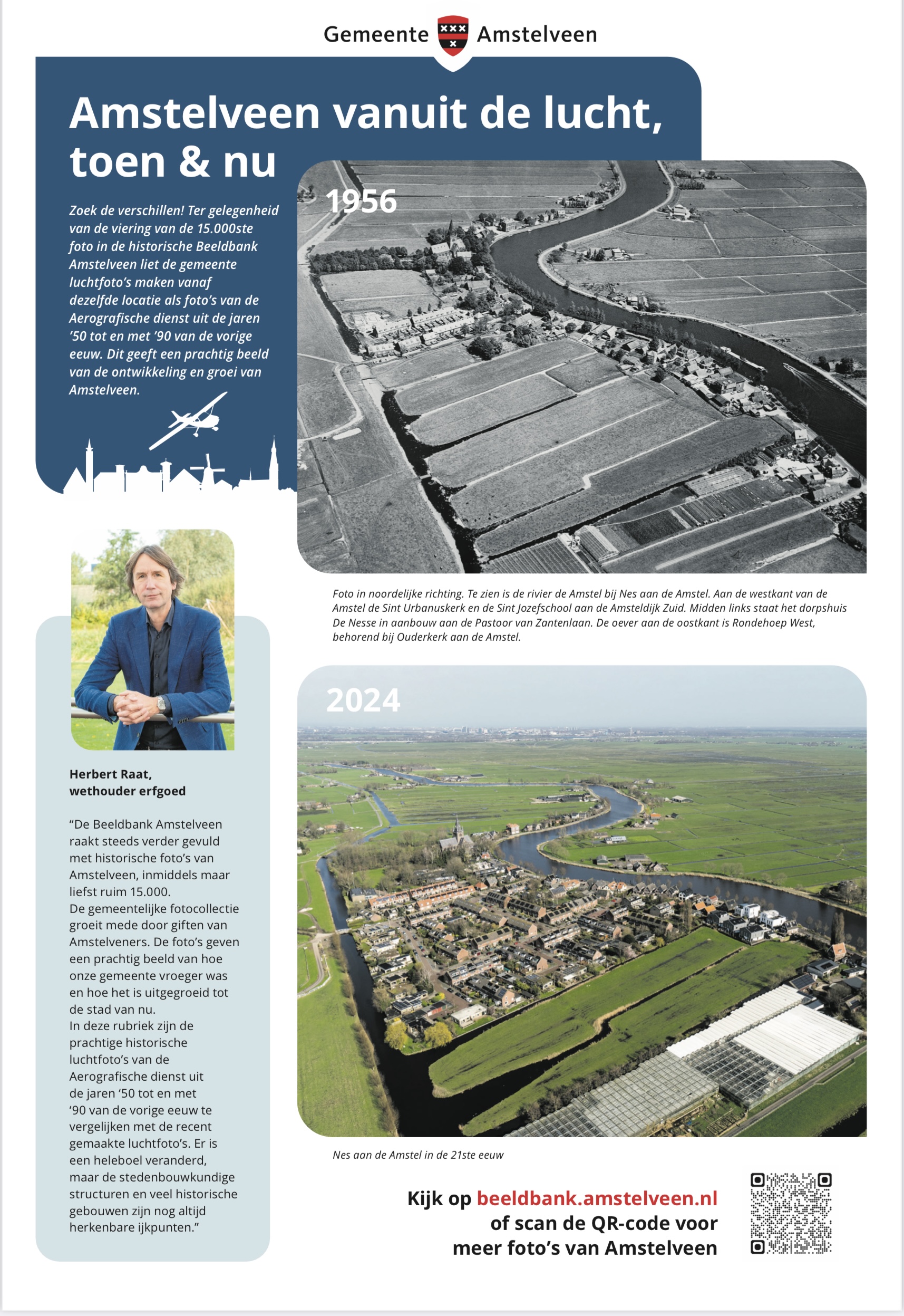 Dit geeft een prachtig beeld van de ontwikkeling en groei van Amstelveen. Vanaf nu kunt u op regelmatige basis deze foto’s met elkaar vergelijken via een themapagina in het Amstelveen Nieuwsblad. Er is een heleboel veranderd, maar de stedenbouwkundige structuren en veel historische gebouwen zijn nog altijd herkenbare ijkpunten.”