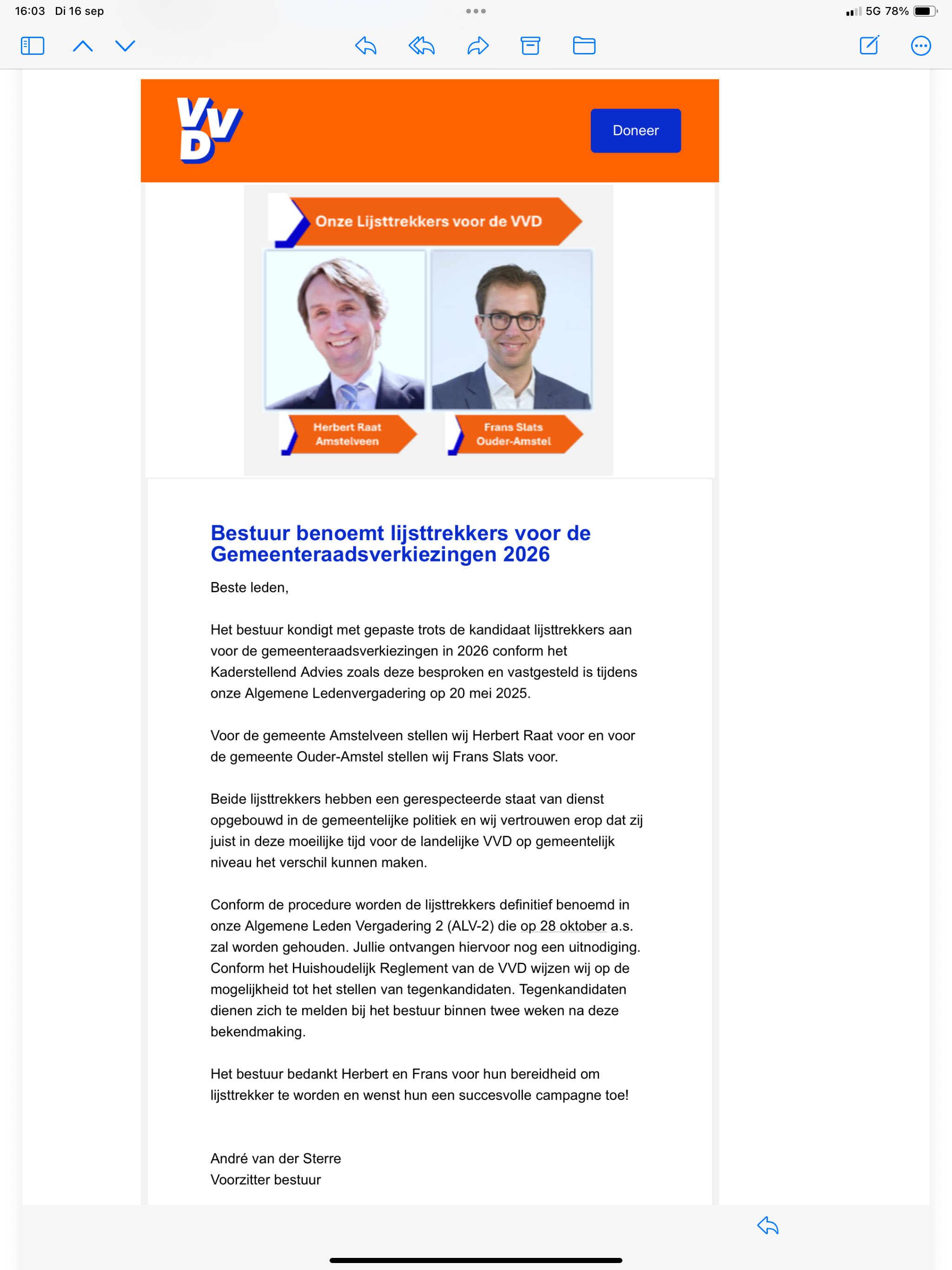 Aankondiging bestuur VVD Andre van der Sterre over lijsttrekkerschap Herbert Raat 2026 Dit delen:TweetVind-ik-leuk Aan het laden...